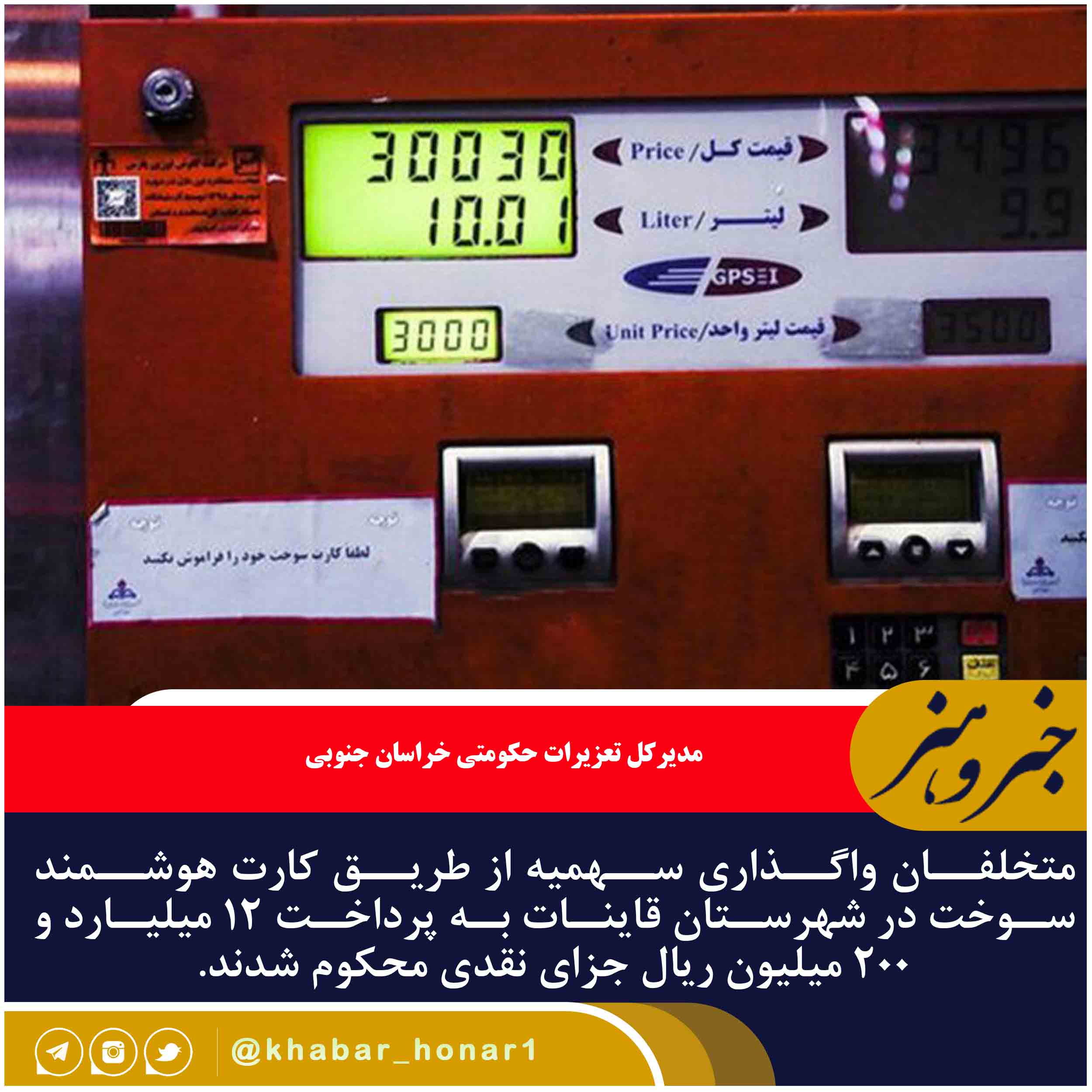 مدیرکل تعزیرات حکومتی خراسان جنوبی گفت: متخلفان واگذاری سهمیه از طریق کارت هوشمند سوخت در شهرستان قاینات به پرداخت ۱۲ میلیارد و ۲۰۰ میلیون ریال جزای نقدی محکوم شدند.