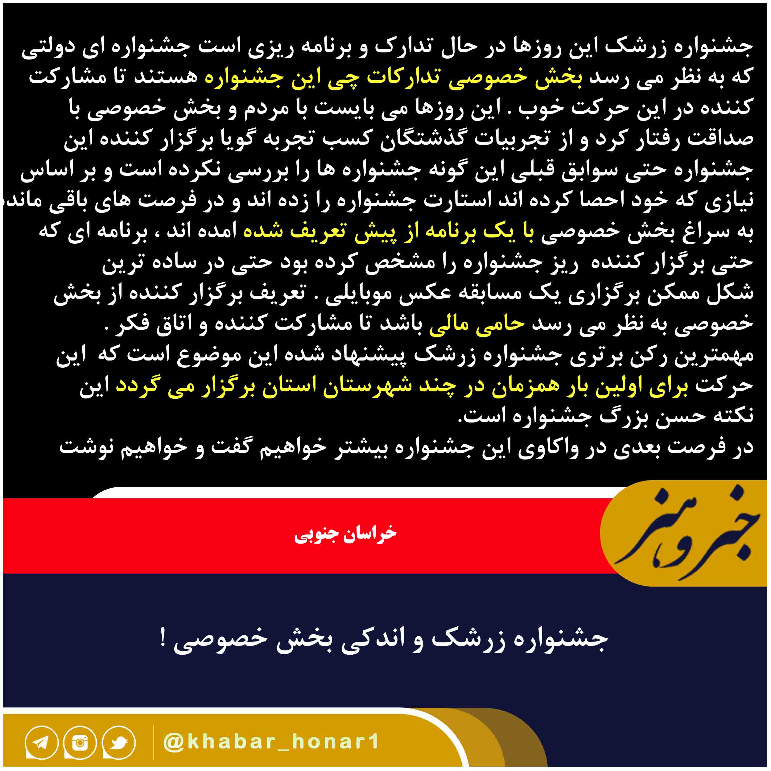 جشنواره زرشک این روزها در حال تدارک و برنامه ریزی است جشنواره ای دولتی که به نظر می رسد بخش خصوصی تدارکات چی این جشنواره هستند تا مشارکت کننده در این حرکت خوب . این روزها می بایست با مردم و بخش خصوصی با صداقت رفتار کرد و از تجربیات گذشتگان کسب تجربه گویا برگزار کننده این جشنواره حتی سوابق قبلی این گونه جشنواره ها را بررسی نکرده است و بر اساس نیازی که خود احصا کرده اند استارت جشنواره را زده اند و در فرصت های باقی مانده به سراغ بخش خصوصی با یک برنامه از پیش تعریف شده امده اند ، برنامه ای که حتی برگزار کننده ریز جشنواره را مشخص کرده بود حتی در ساده ترین شکل ممکن برگزاری یک مسابقه عکس موبایلی . تعریف برگزار کننده از بخش خصوصی به نظر می رسد حامی مالی باشد تا مشارکت کننده و اتاق فکر . مهمترین رکن برتری جشنواره زرشک پیشنهاد شده این موضوع است که این حرکت برای اولین بار همزمان در چند شهرستان استان برگزار می گردد این نکته حسن بزرگ جشنواره است. در فرصت بعدی در واکاوی این جشنواره بیشتر خواهیم گفت و خواهیم نوشت