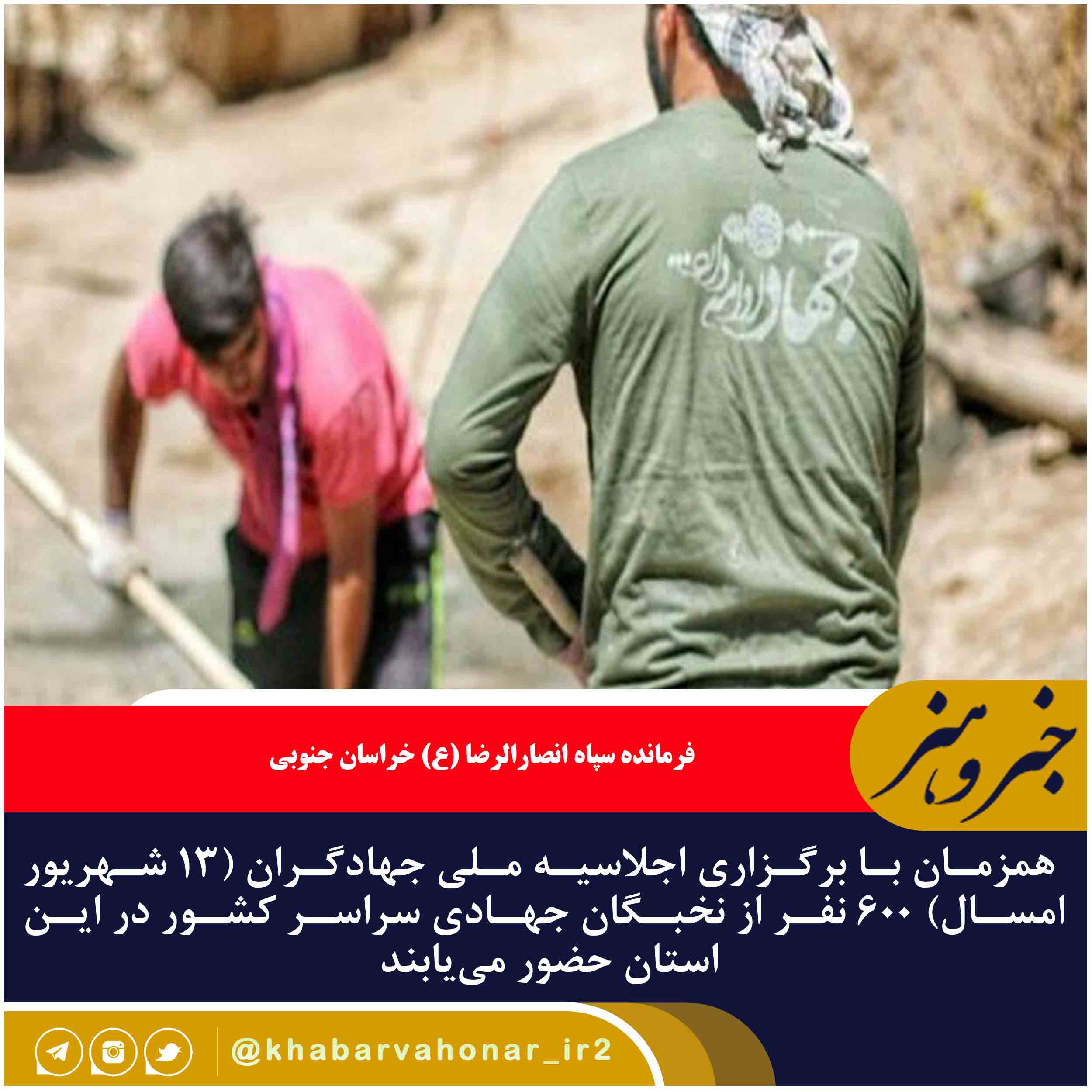 فرمانده سپاه انصارالرضا (ع) خراسان جنوبی گفت: همزمان با برگزاری اجلاسیه ملی جهادگران (۱۳ شهریور امسال) ۶۰۰ نفر از نخبگان جهادی سراسر کشور در این استان حضور مییابند.