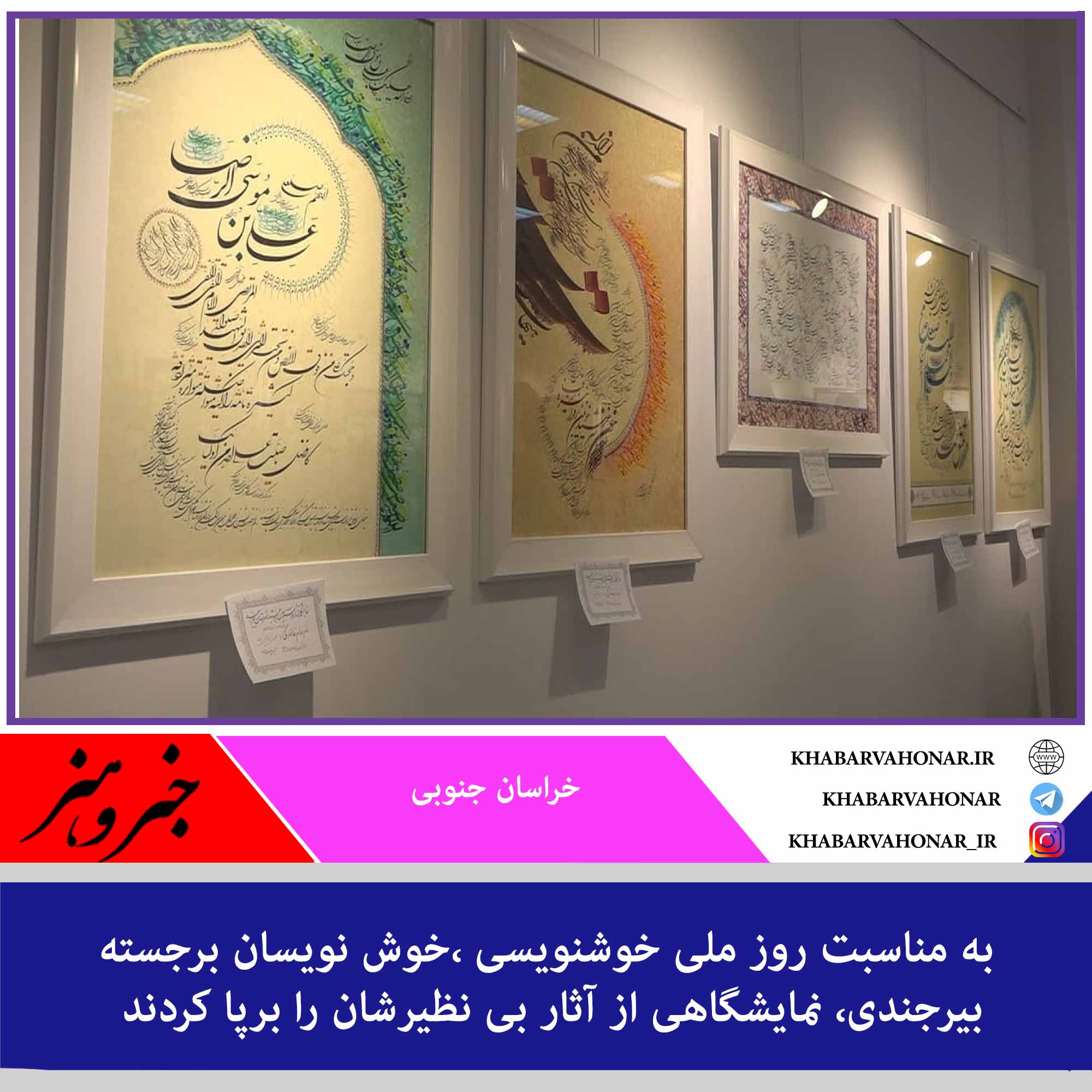مدیر انجمن خوش نویسان خراسان جنوبی بیان کرد: نمایشگاه آثار خوش نویسان برجسته بیرجندی به مدت یک هفته صبحها از ساعت ۹ الی ۱۱ و عصرها از ساعت ۱۷ الی ۱۹ در نگارخانه استاد مهدی اسماعیلی مود واقع در خیابان شهید محلاتی، جنب اداره کل فرهنگ و ارشاد اسلامی استان برای بازدید علاقهمندان دایر است.