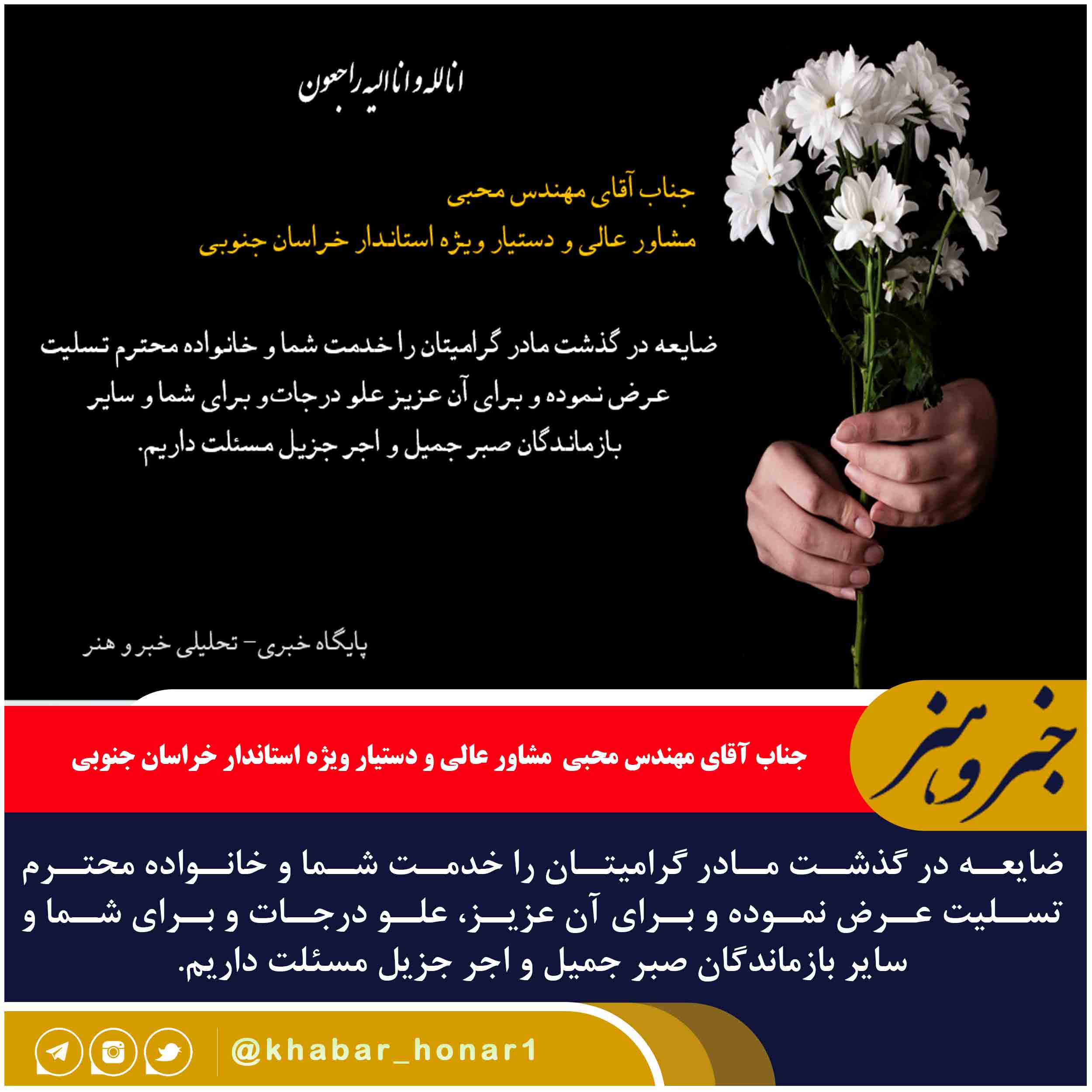 جناب آقای مهندس محبی ضایعه در گذشت مادر گرامیتان را خدمت شما و خانواده محترم تسلیت عرض می کنیم