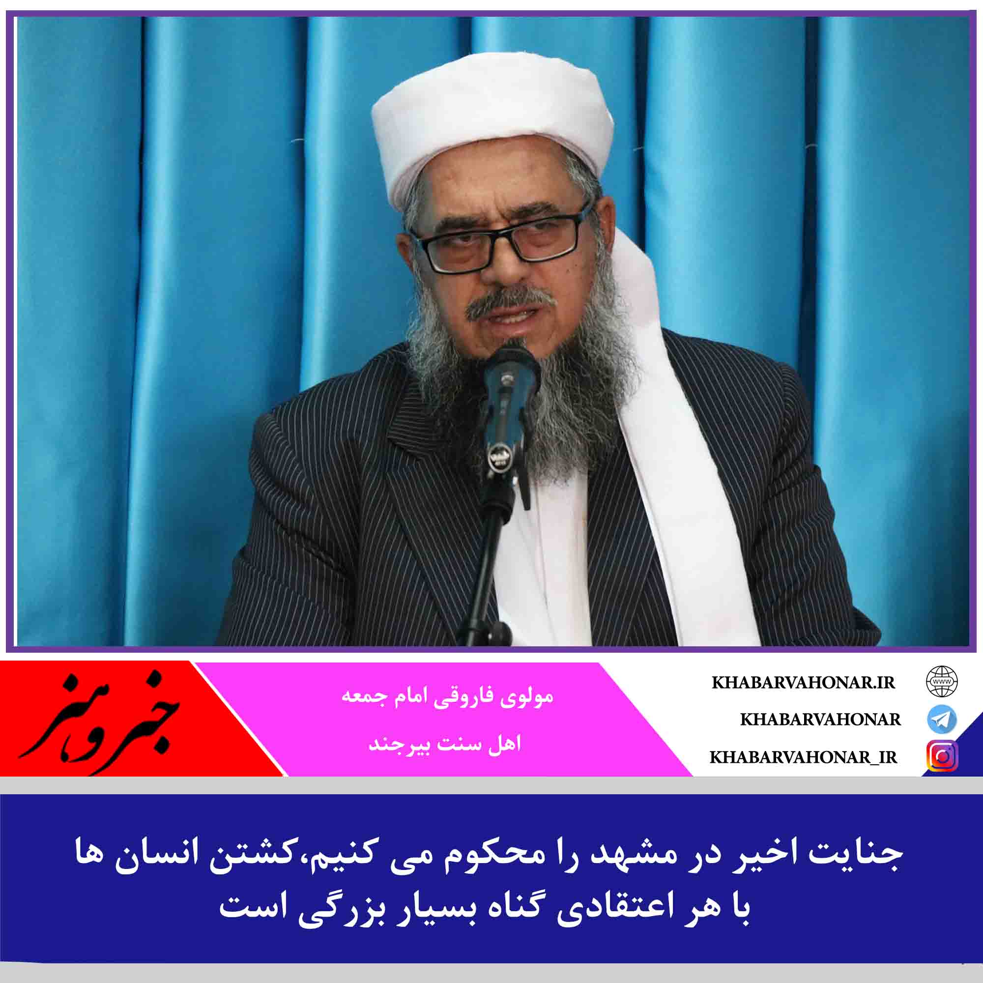 مولوی غلام حیدر فاروقی، امام جمعه اهل سنت ضمن محکوم کردن حادثه روز گذشته در حرم مطهر امام رضا (ع) که منجر به شهادت یک طلبه شد، اظهار کرد: کشتن انسان ها با هر اعتقادی به هر نحوی را محکوم می کنیم و گناه بسیار بزرگی است.
