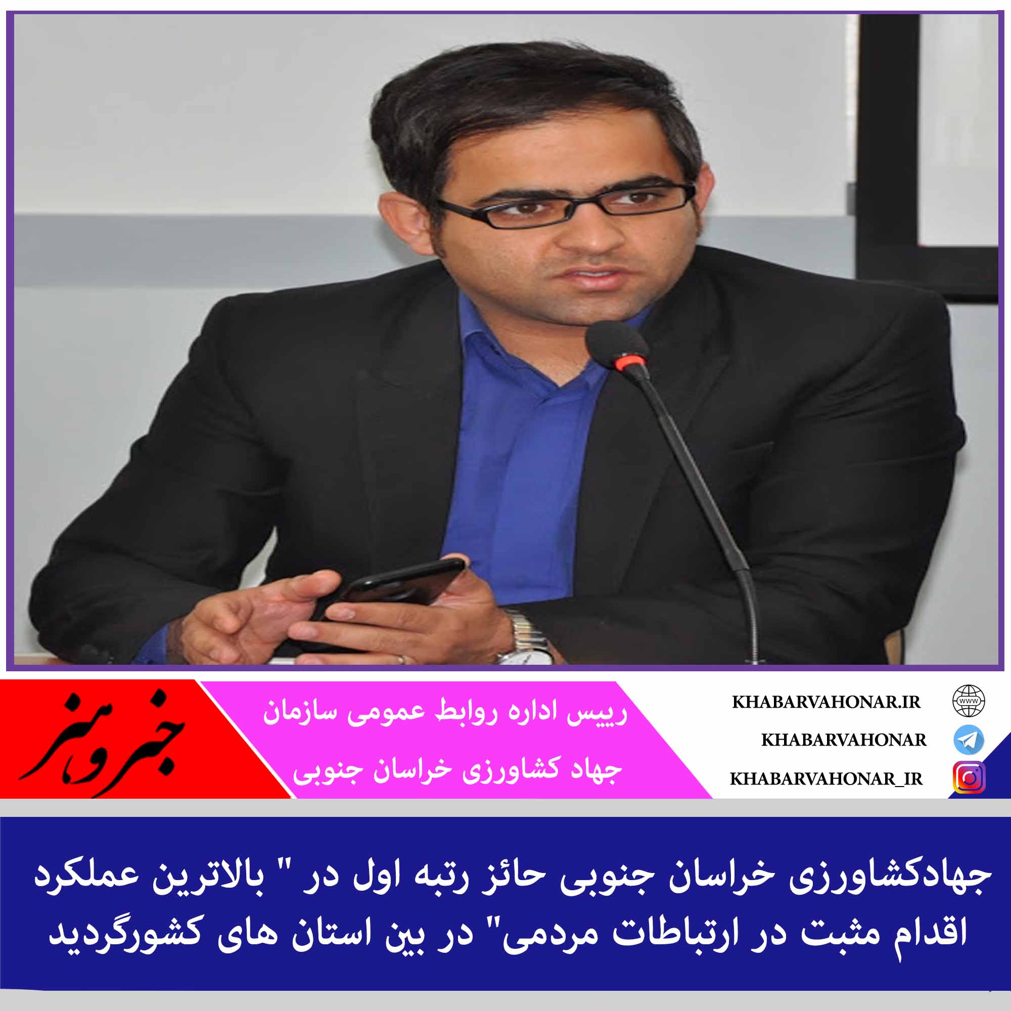 حامد عارفی نیا ادامه داد: بر همین اساس و به استناد نامه سرپرست مرکز روابط عمومی و اطلاع رسانی وزارت جهاد کشاورزی، ریاست سازمان جهادکشاورزی خراسان جنوبی حائز رتبه اول در ” بالاترین عملکرد اقدام مثبت در ارتباطات مردمی” در بین استان های کشورگردیده است که موفقیت بسیار ارزشمندی در حوزه ارتباطات مردمی محسوب می گردد.
