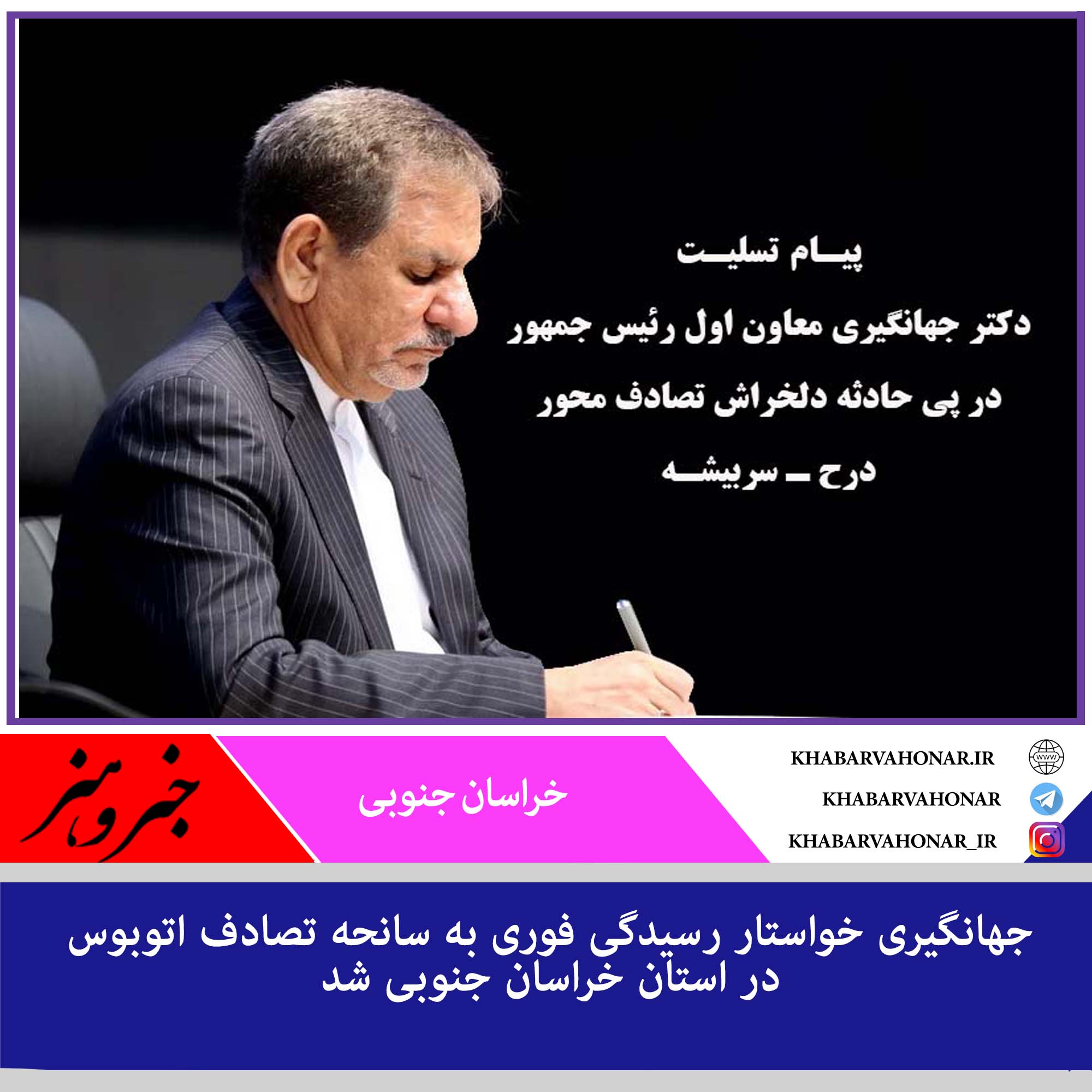 اسحاق جهانگیری روز شنبه در پیامی نوشت: حادثه دلخراش تصادف اتوبوس در محور درح – سربیشه استان خراسان جنوبی که منجر به جان باختن ۱۳ نفر و مصدومیت ۸ نفر دیگر از هموطنان عزیز شد، موجب تأثر و تألم فراوان شد.