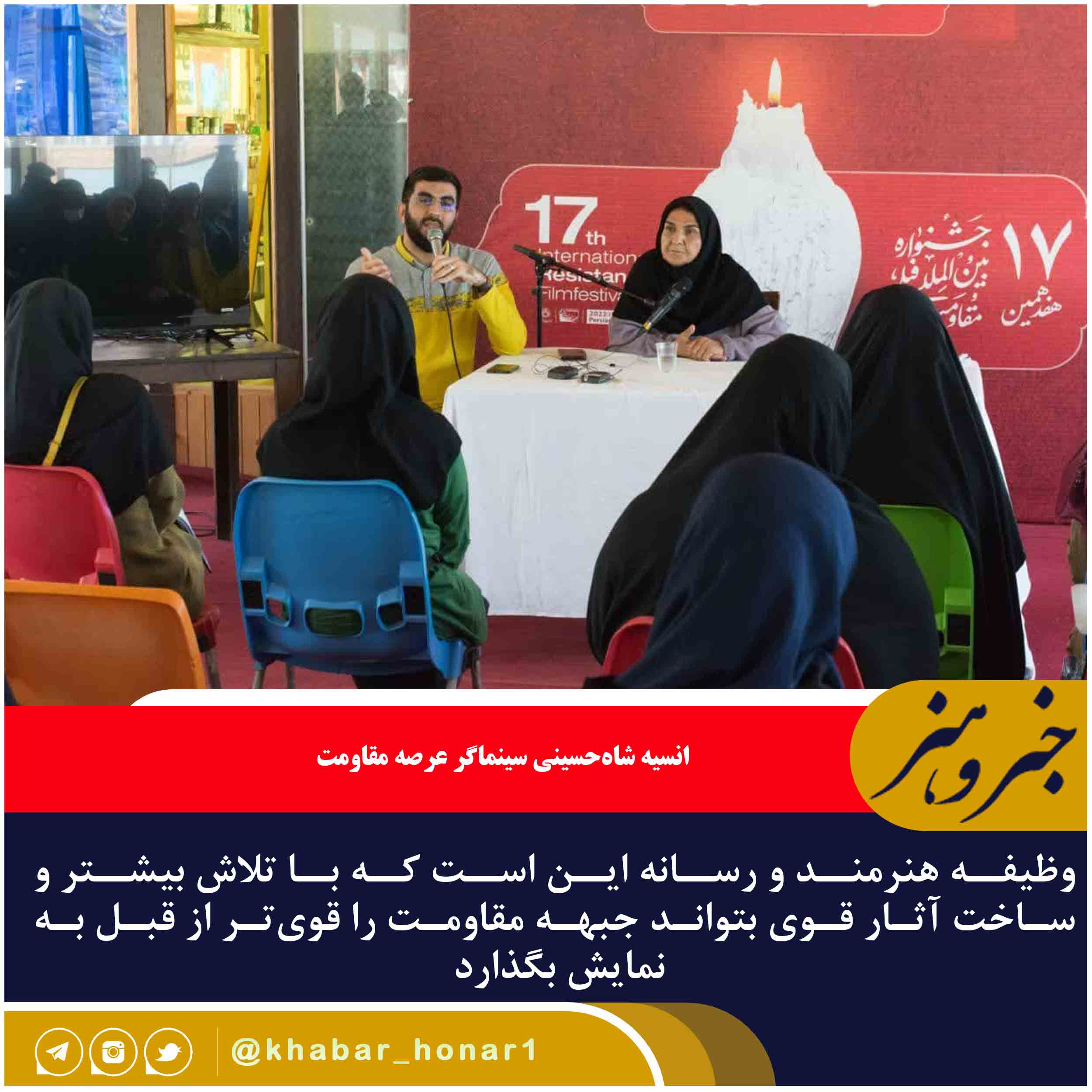انسیه شاه حسینی کارگردان و فیلمنامه نویس گفت: وظیفه هنرمند و رسانه این است که با تلاش بیشتر و ساخت آثار قوی بتواند جبهه مقاومت را قویتر از قبل به نمایش بگذارد.