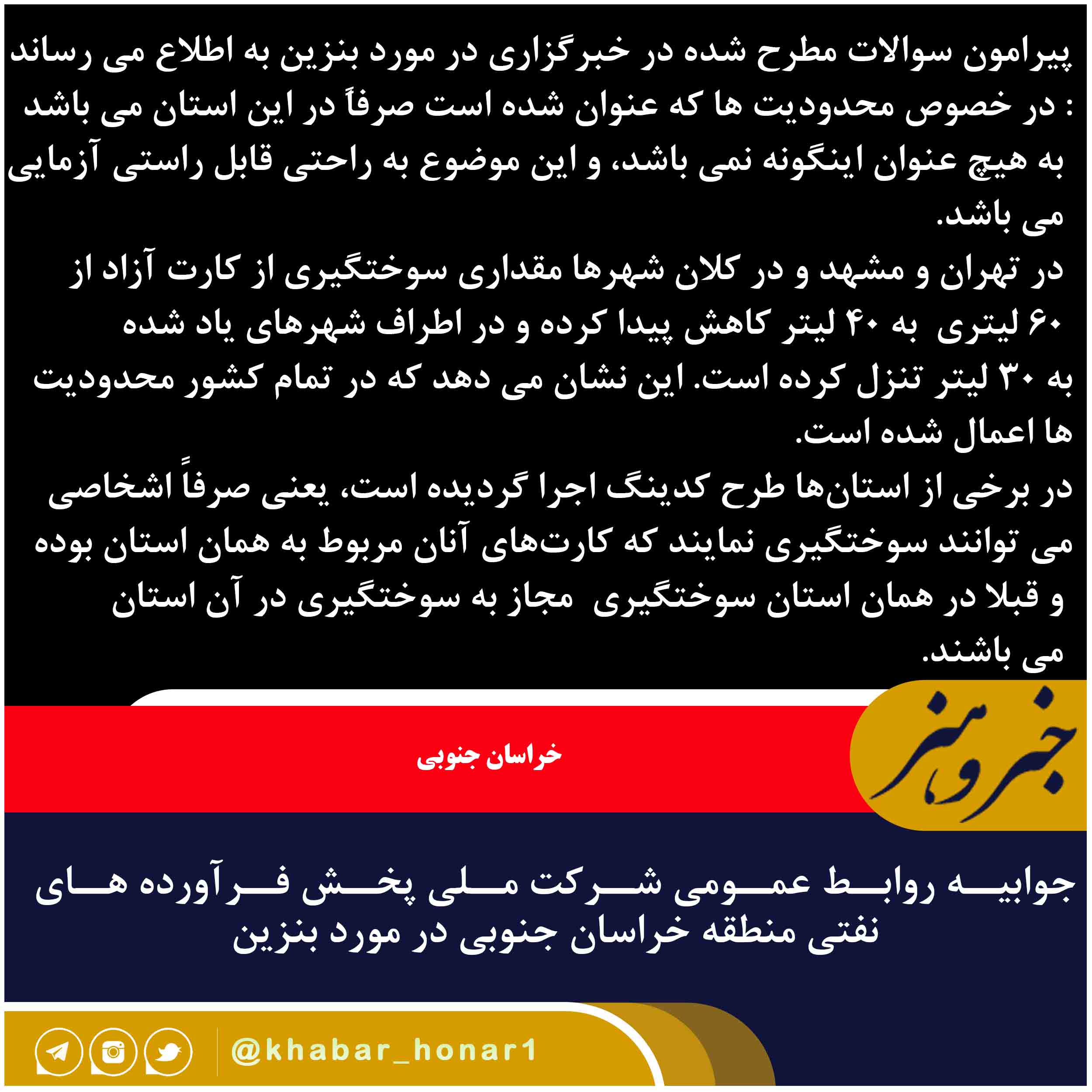 پیرامون سوالات مطرح شده در خبرگزاری در مورد بنزین به اطلاع می رساند: در خصوص محدودیت ها که عنوان شده است صرفاً در این استان می باشد به هیچ عنوان اینگونه نمی باشد، و این موضوع به راحتی قابل راستی آزمایی می باشد.