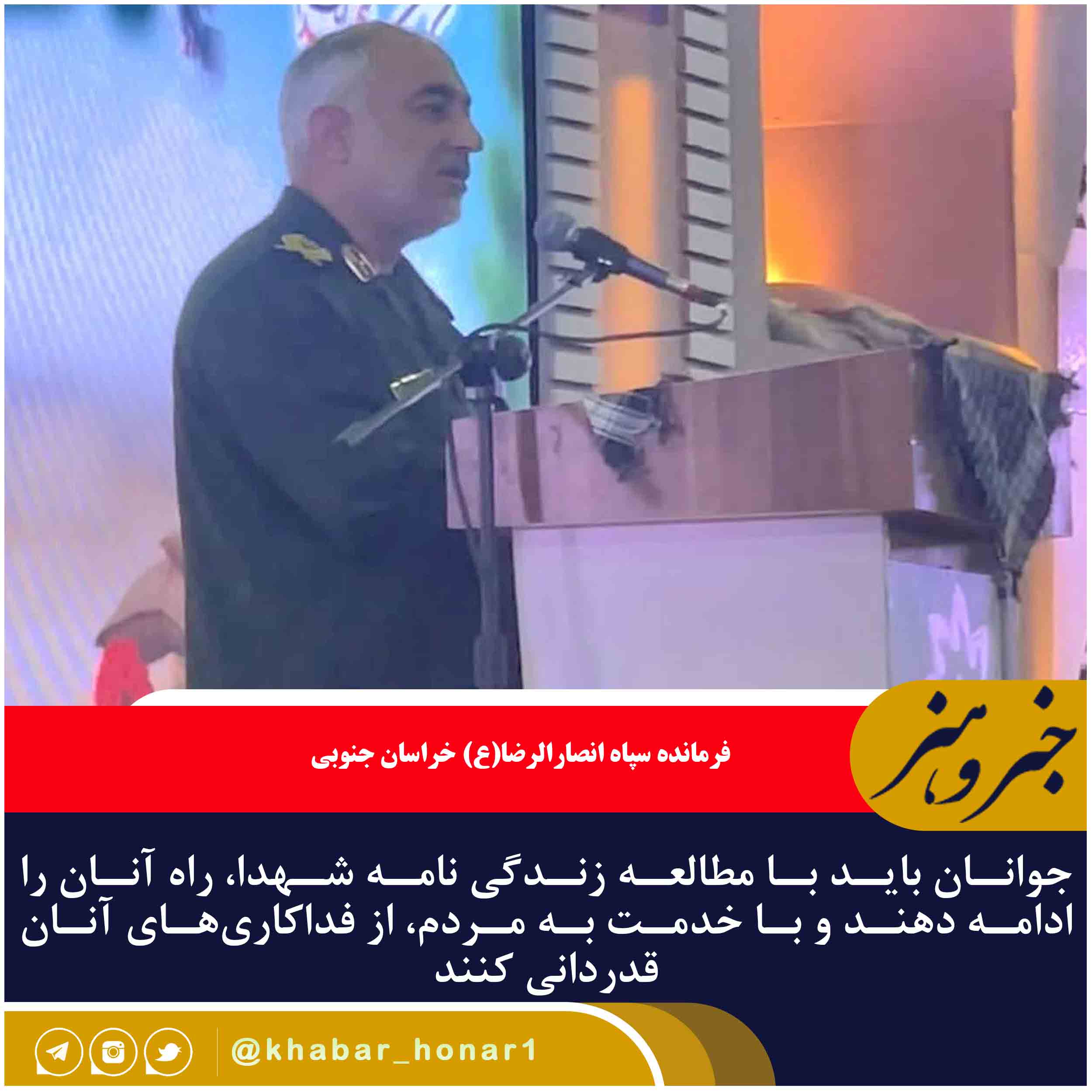 🔹فرمانده سپاه انصارالرضا(ع) تأکید کرد: نهبندان همواره در خط مقدم دفاع از انقلاب اسلامی بوده و شهیدان این منطقه با دلیری خود در برابر دشمنان ایستادهاند.