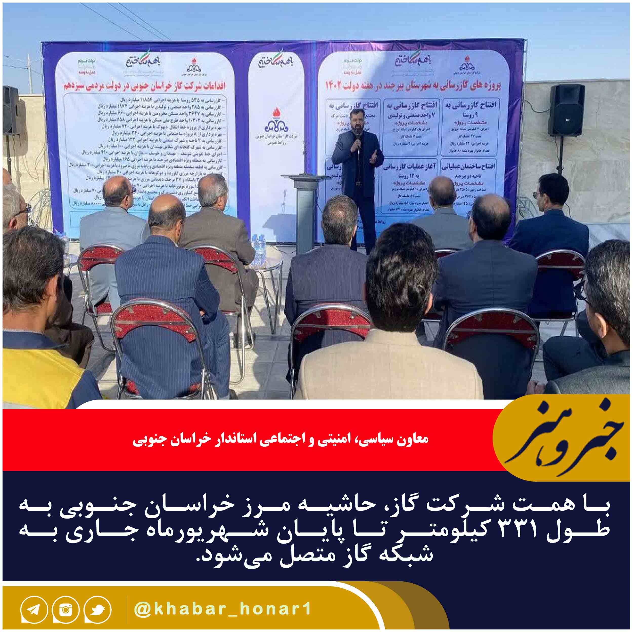 معاون سیاسی، امنیتی و اجتماعی استاندار خراسان جنوبی گفت: با همت شرکت گاز، حاشیه مرز خراسان جنوبی به طول ۳۳۱ کیلومتر تا پایان شهریورماه جاری به شبکه گاز متصل میشود.