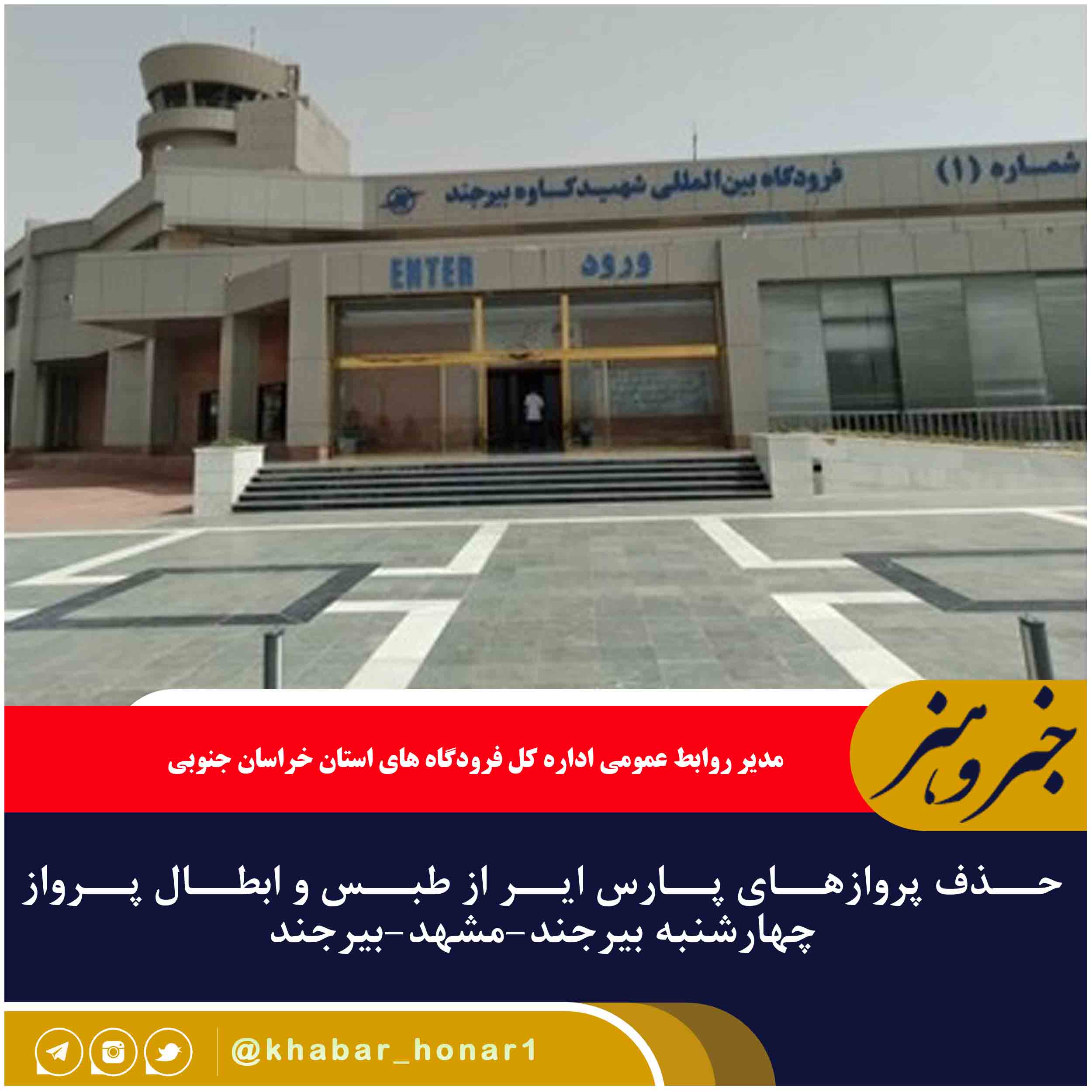 مدیر روابط عمومی اداره کل فرودگاه های استان خراسان جنوبی گفت: پرواز چهارشنبه شرکت هواپیمایی ایران ایر در مسیر بیرجند-مشهد-بیرجند تا دوم آبان ماه ابطال گردید.