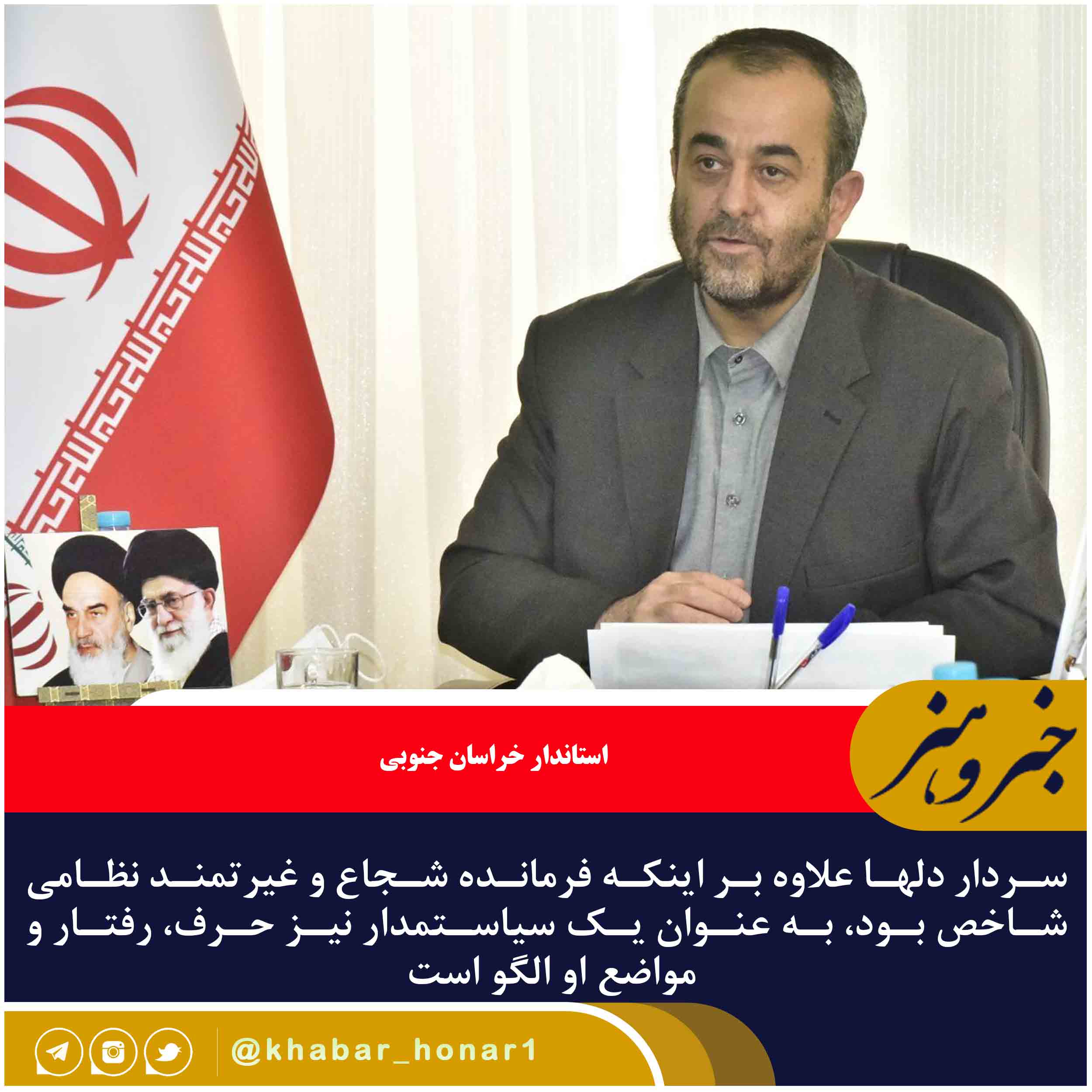 استاندار خراسان جنوبی اظهار داشت: سردار سلیمانی به مصداق عینی آیه شریفه “در میان مؤمنان مردانی هستند که بر سر عهدی که با خدا بستهاند صادقانه ایستادهاند؛ بعضی پیمان خود را به آخر بردند و بعضی دیگر در انتظارند و هرگز تغییر و تبدیلی در عهد و پیمان خود ندادند” (آیه ۲۳ سوره احزاب)، پس از عمری جهاد در راه دفاع از کیان اسلام و مبارزه با دشمنان دین و قرآن به امید لقاء الله در لباس رزم، به افتخار شهادت نائل آمد.