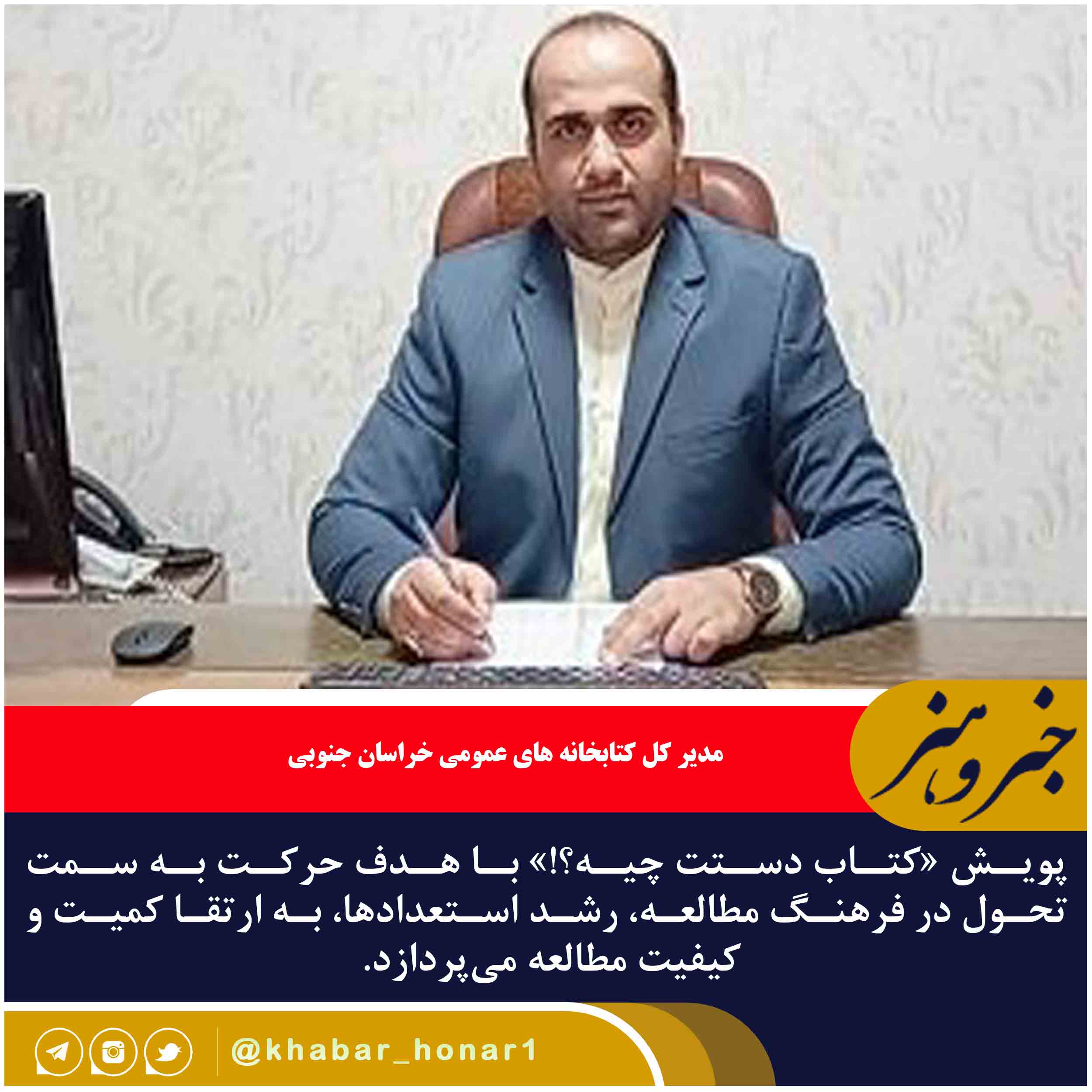 ? مدیر کل کتابخانه های عمومی خراسان جنوبی از برگزاری پویش ملی «کتاب دستت چیه؟» با هدف ترویج فرهنگ کتاب و کتابخوانی در استان خبر داد : در این پویش مردم در قالب کلیپهای کوتاه کمتر از دو دقیقه یکی از کتابهایی را که مطالعه کردهاند به دیگران معرفی کنند تا با گردش و دست به دست شدن این کلیپها، انگیزه و اشتیاق برای خرید و مطالعه کتاب افزایش یابد.