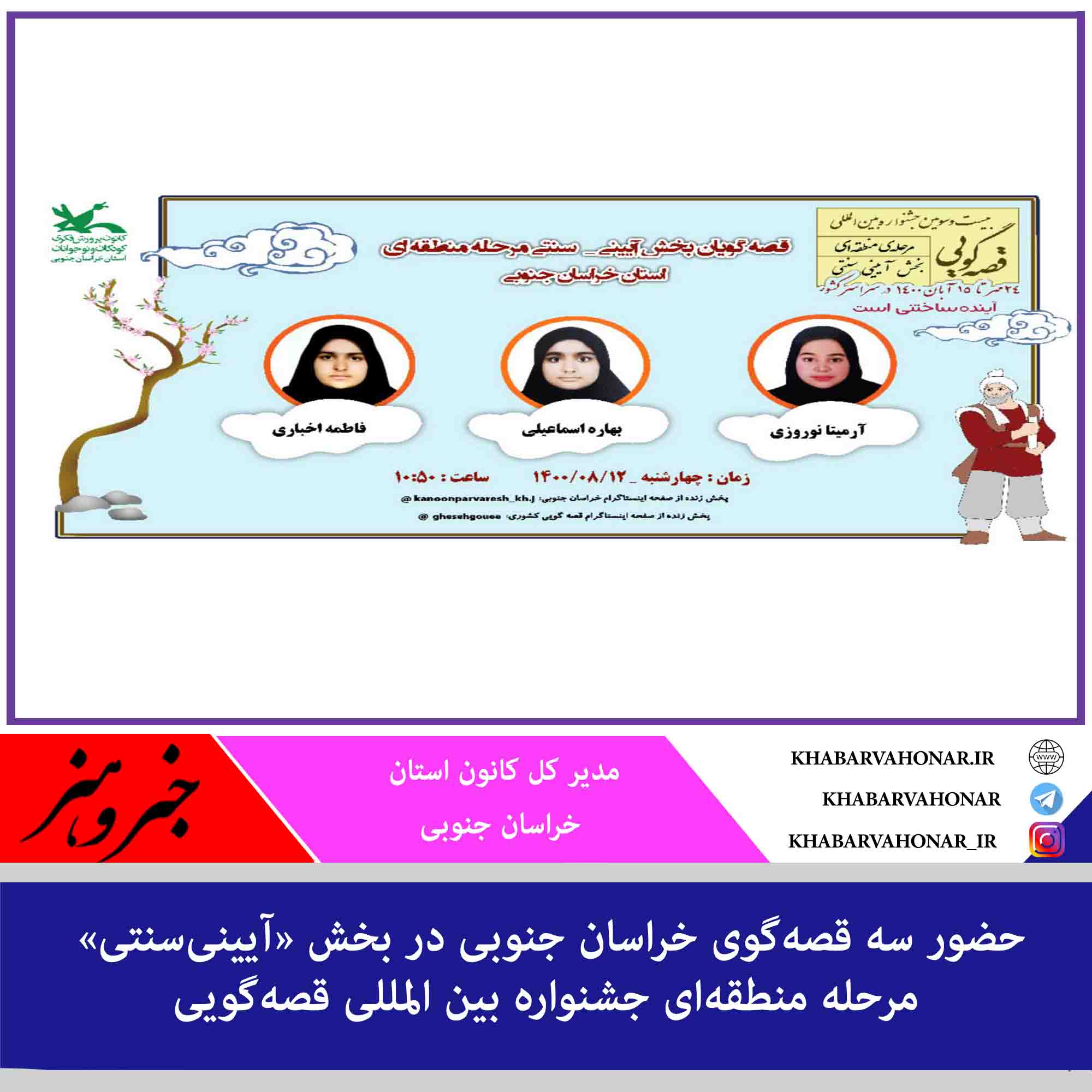 طاهره حمیدی مدیر کل کانون استان در این خصوص گفت: داوری مرحله منطقهای بخش «قصههای آیینی و سنتی» از روز ۸ آبان ماه آغاز شده است که در این مرحله سه قصهگوی کانون خراسان جنوبی ۱۲ آبان ماه ۱۴۰۰ با ۷۱ قصهگو از استانهای بوشهر، البرز، تهران، چهارمحال و بختیاری، خراسان رضوی، خراسان شمالی، زنجان، ایلام، خوزستان، سمنان، قزوین، سیستان و بلوچستان، فارس، کرمان، کرمانشاه، گلستان، گیلان، اصفهان، لرستان، مازندران، مرکزی، هرمزگان، همدان و یزد به رقابت خواهند پرداخت.