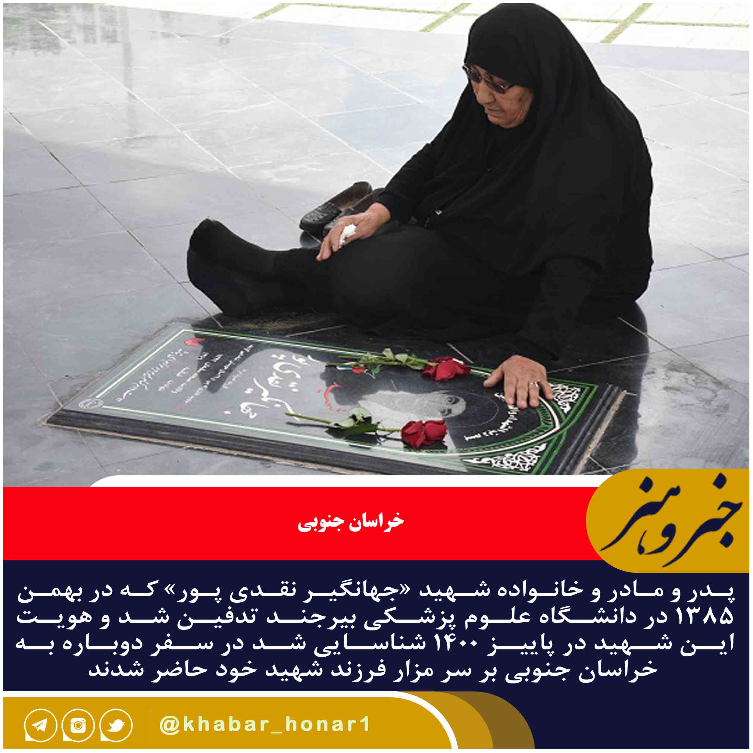 پدر و مادر و خانواده شهید «جهانگیر نقدی پور» که در بهمن ۱۳۸۵ در دانشگاه علوم پزشکی بیرجند تدفین شد و هویت این شهید در پاییز ۱۴۰۰ شناسایی شد در سفر دوباره به خراسان جنوبی بر سر مزار فرزند شهید خود حاضر شدند.