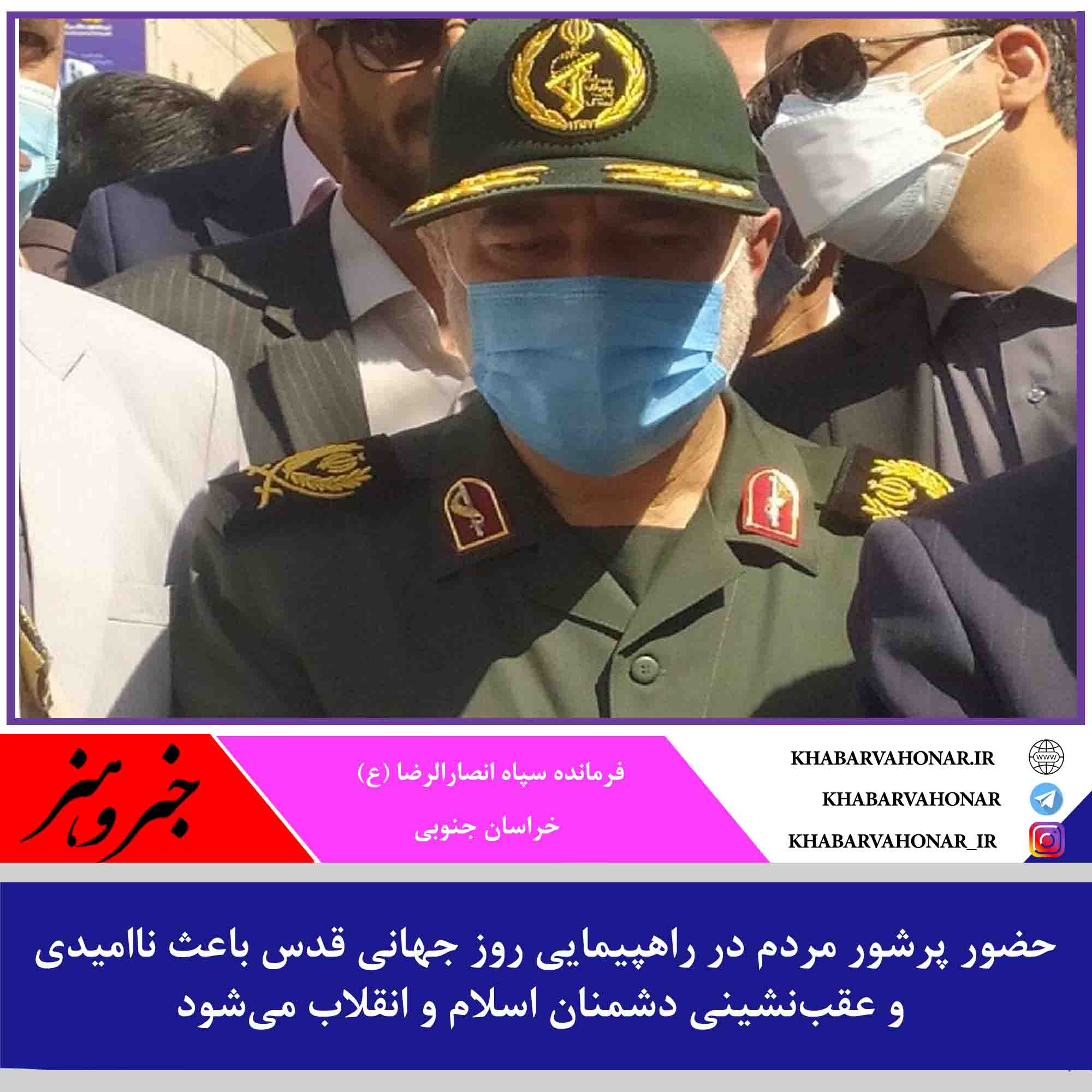 سردار محمدرضا مهدوی روز جمعه در حاشیه راهپیمایی روز قدس در شهر بیرجند به خبرنگار ایرنا گفت: همان گونه که رژیم غاصب اسرائیل خودش میداند امروز روز اضمحلال آن است، هرچه حضور مردم در صحنه بیشتر باشد، قطعا در اینکه دشمن به اضمحلال بیشتر نزدیک شود، موثر خواهد بود.