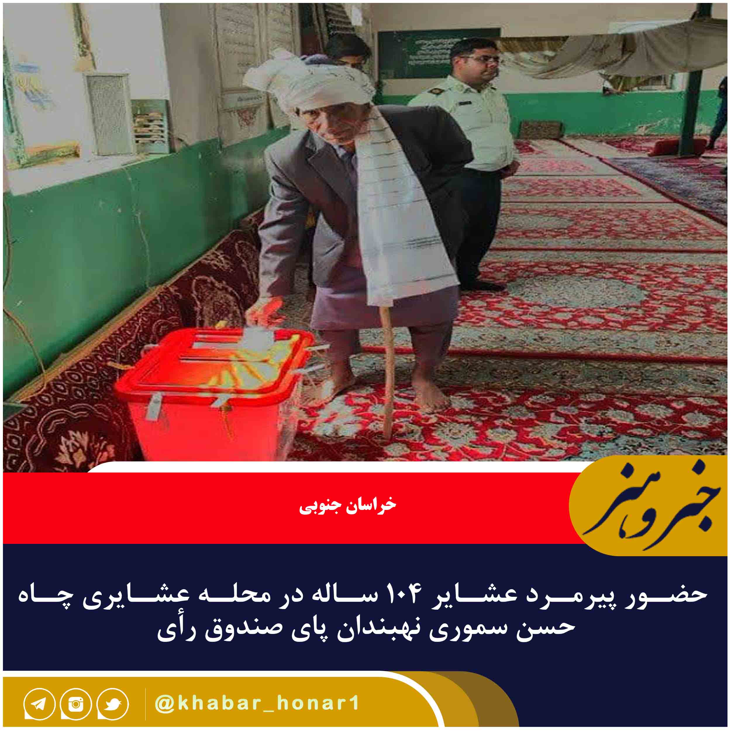 حضور پیرمرد عشایر ۱۰۴ ساله در محله عشایری چاه حسن سموری نهبندان پای صندوق رأی
