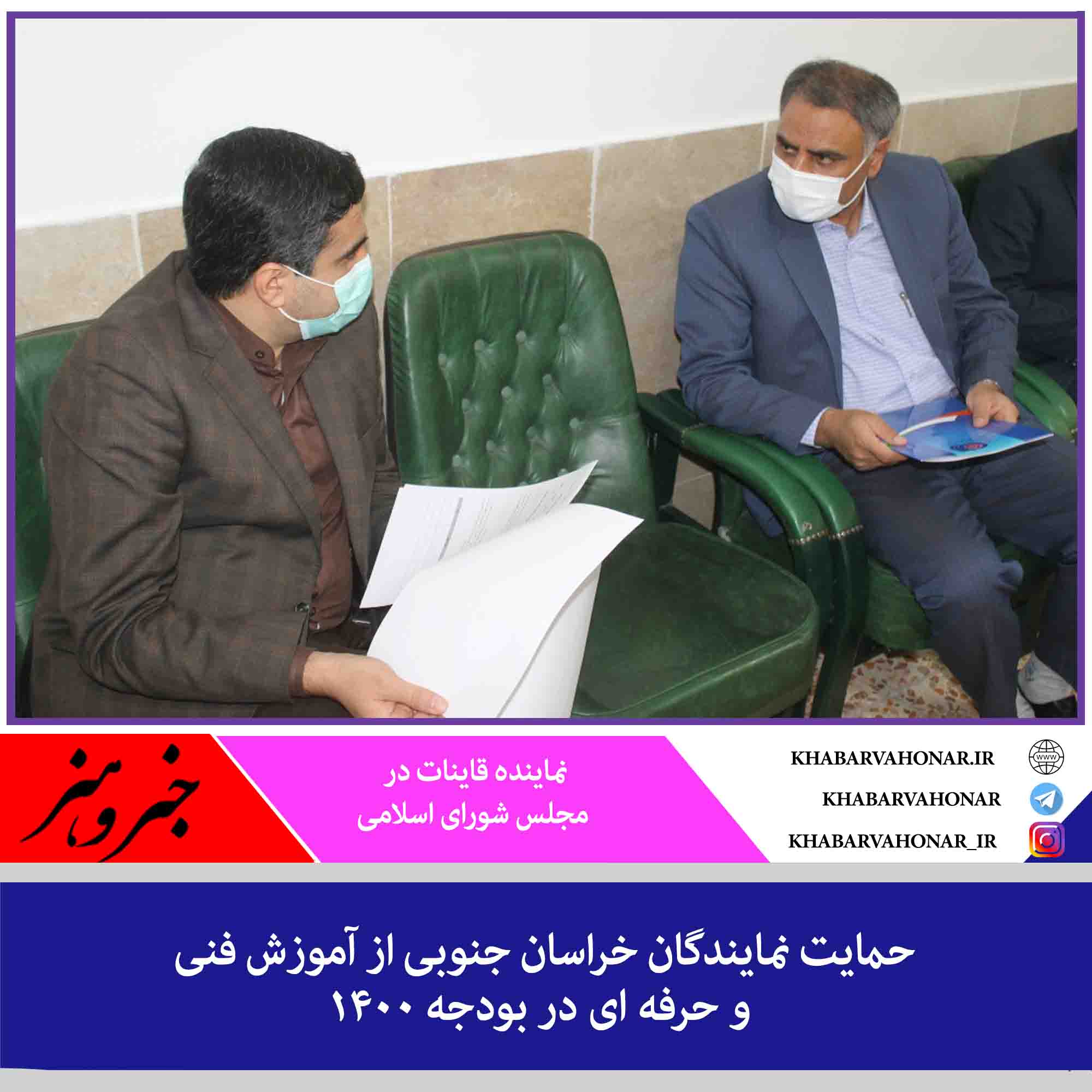 در این دیدار مدیر کل آموزش فنی و حرفه ای استان با اشاره به نقش آموزشهای مهارتی و توسعه فرهنگ مهارت آموزی در جهت رفع معضل اشتغال به تشریح سیاستها و برنامه های سازمان آموزش فنی و حرفه ای پرداخت. خوش آیند در ادامه با ارائه گزارش علمکردی از اقدامات اداره کل استان اقدامات انجام گرفته توسط اداره کل در حوزه انتخابیه قاینات از جمله اخد چارت سازمانی مرکز زیرکوه و سایر اقدامات صورت گفته را عنوان نمود. وی در ادامه به تشریح دغدغه ها و مسائل آموزش فنی و حرفه ای پرداخت و عنوان کرد: این اداره کل با وجود مراکزی با پتانسیل بالا و ظرفیت های گوناگون آموزشی، سعی داشته تا در راستای توانمند نمودن افراد فاقد مهارت نقش مهمی در حل معضل اشتغال افراد بخصوص جوانان داشته باشد. خوش آیند در پایان خواستار توجه نمایندگان مجلس شورای اسلامی به سازمان آموزش فنی و حرفه ای در بودجه ۱۴۰۰ شد و اضهار امیدواری نمود سهم آموزش های مهارتی در بودجه ۱۴۰۰ پررنگ تر از سنوات گذشته باشد.