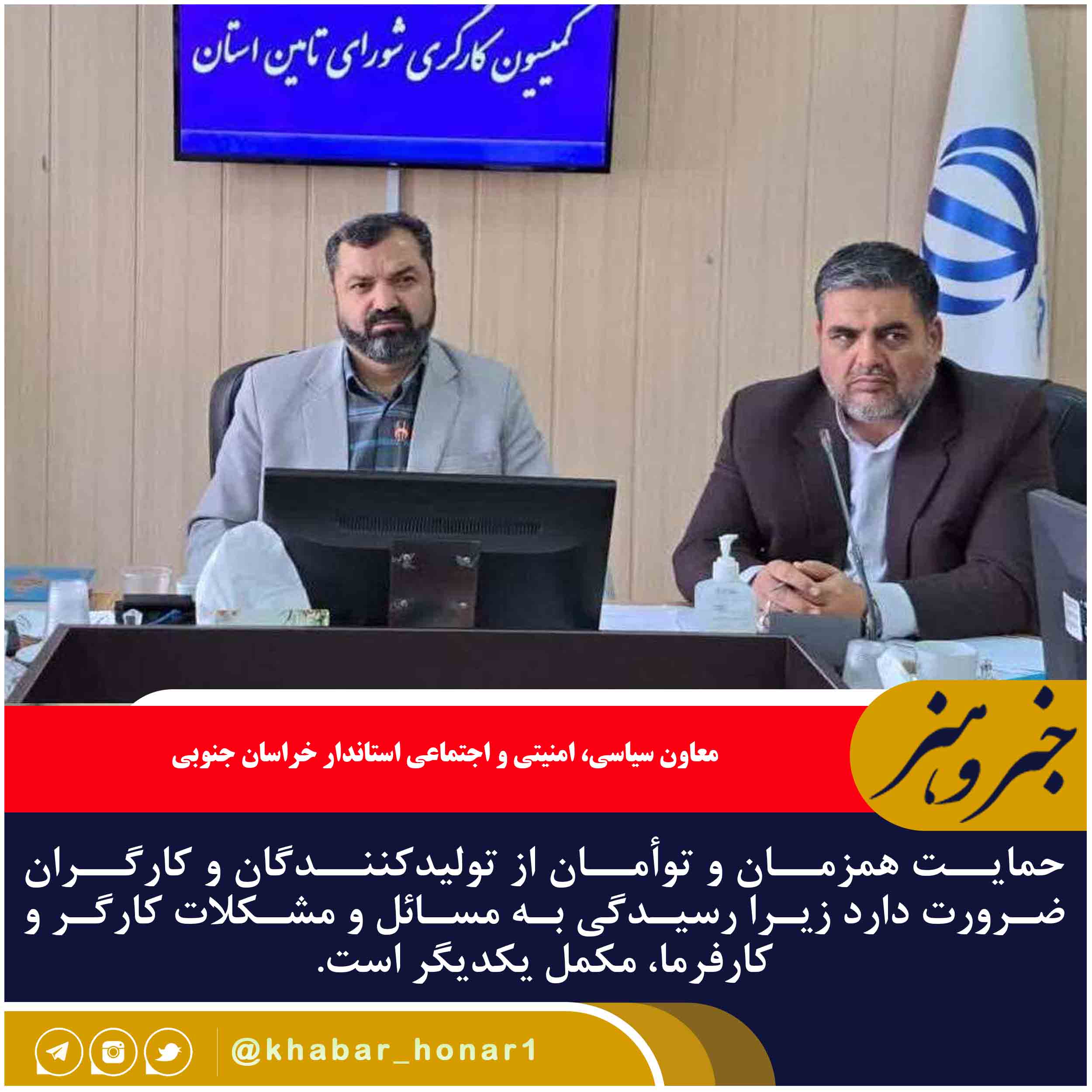 معاون سیاسی، امنیتی و اجتماعی استاندار خراسان جنوبی گفت: حمایت همزمان و توأمان از تولیدکنندگان و کارگران ضرورت دارد زیرا رسیدگی به مسائل و مشکلات کارگر و کارفرما، مکمل یکدیگر است.