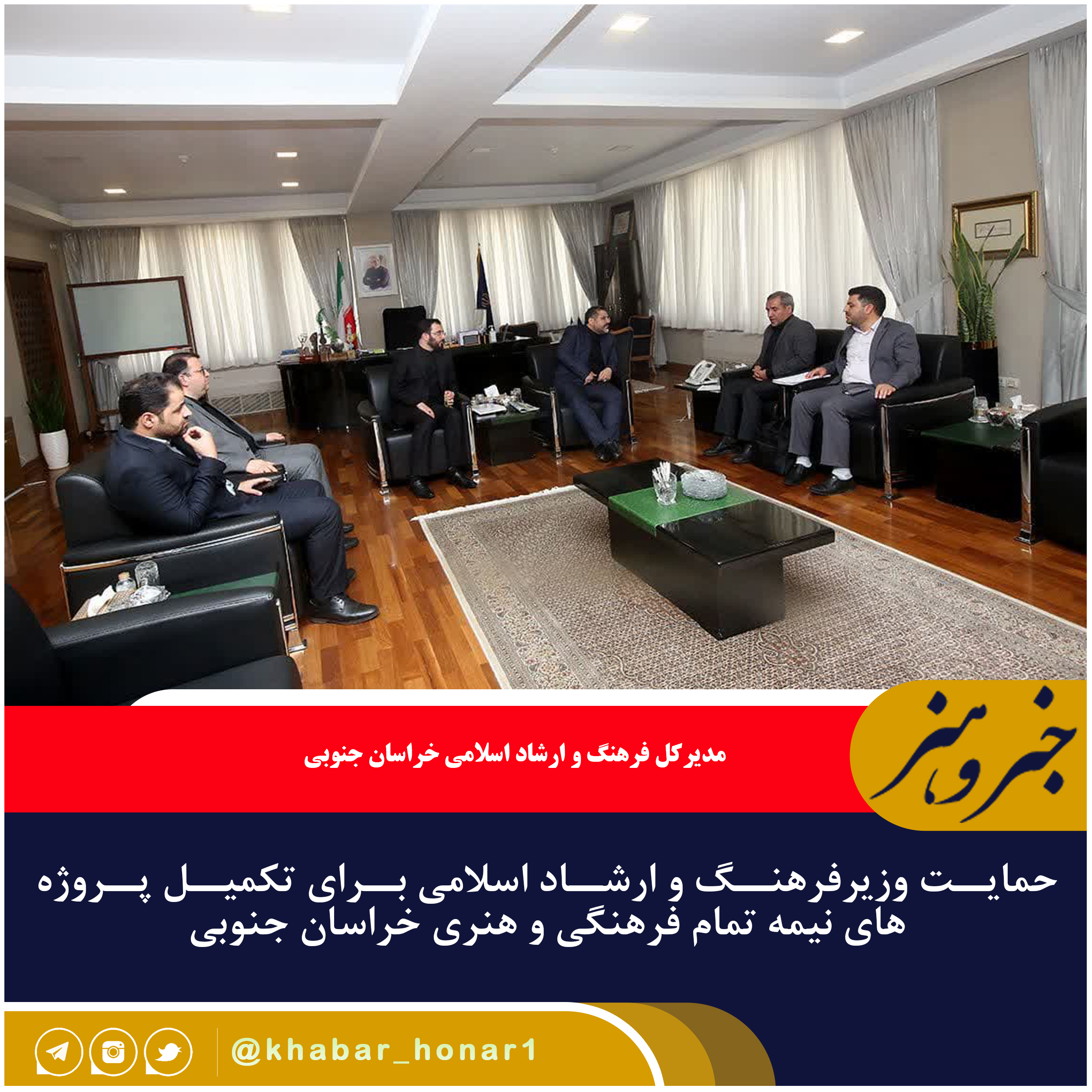 در طی دیدار مدیرکل فرهنگ و ارشاد اسلامی استان به همراه نماینده مردم بیرجند، درمیان و خوسف در مجلس شورای اسلامی با محمد مهدی اسماعیلی، وزیر فرهنگ و ارشاد اسلامی در خصوص مشکلات زیر ساختی و پروژه های نیمه تمام شهرستان های درمیان، خوسف و بیرجند بحث و تبادل نظر صورت پذیرفت. علی فرخنده؛ مدیرکل فرهنگ و ارشاد اسلامی استان به همراه حسین خسروی اسفزار؛ نماینده مردم شهرستان های بیرجند، درمیان و خوسف در مجلس شورای اسلامی، امروز ۶ تیرماه ۱۴۰۲ با محمد مهدی اسماعیلی وزیر فرهنگ و ارشاد اسلامی دیدار و در خصوص توانمندی ها، مسایل و مشکلات فرهنگی و هنری استان خراسان جنوبی تبادل نظر کردند.
