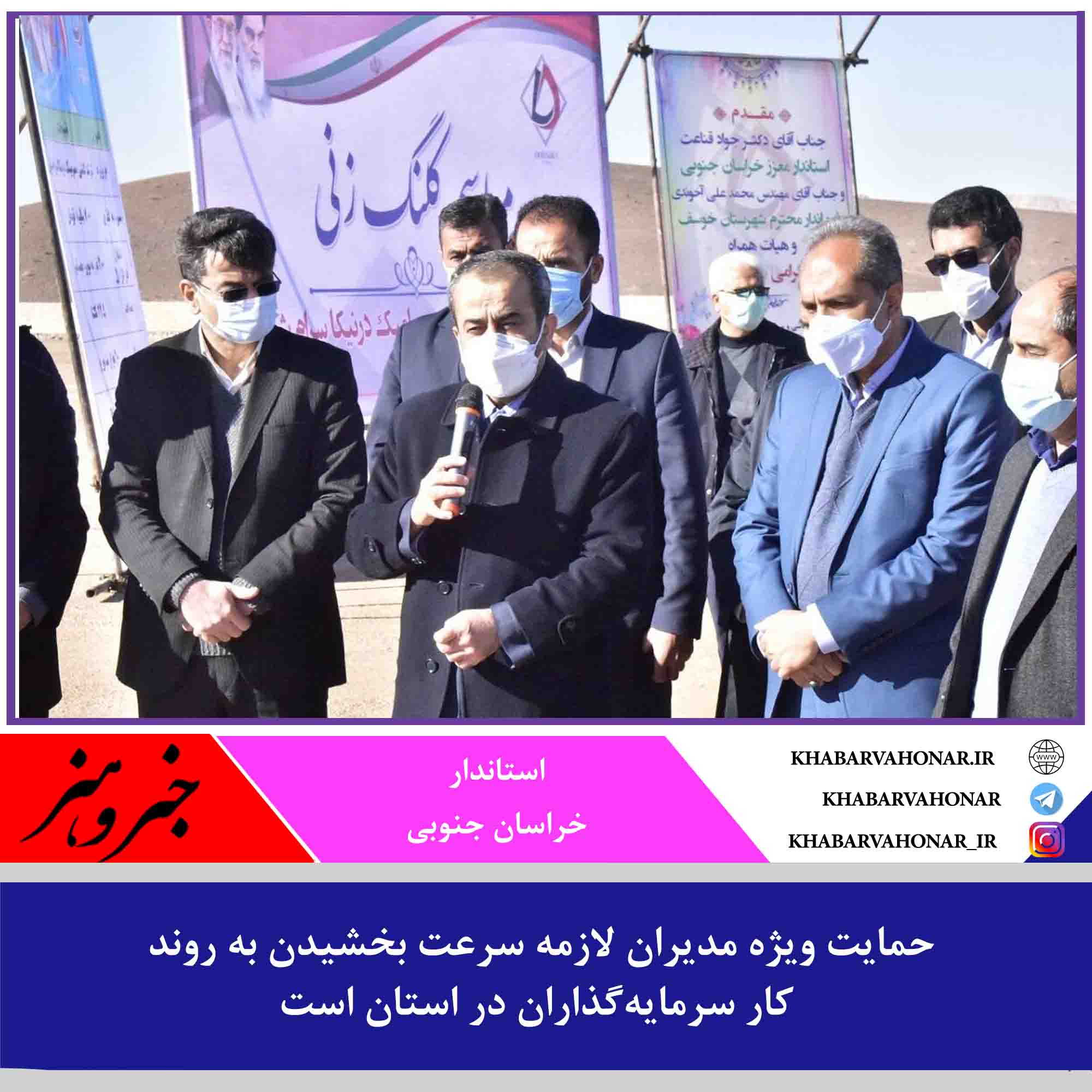 استاندار خراسان جنوبی گفت: حمایت ویژه مدیران لازمه سرعت بخشیدن به روند کار سرمایهگذاران در استان است تا پروژههای بخش خصوصی با سرعت قابل قبول پیش برود.