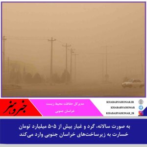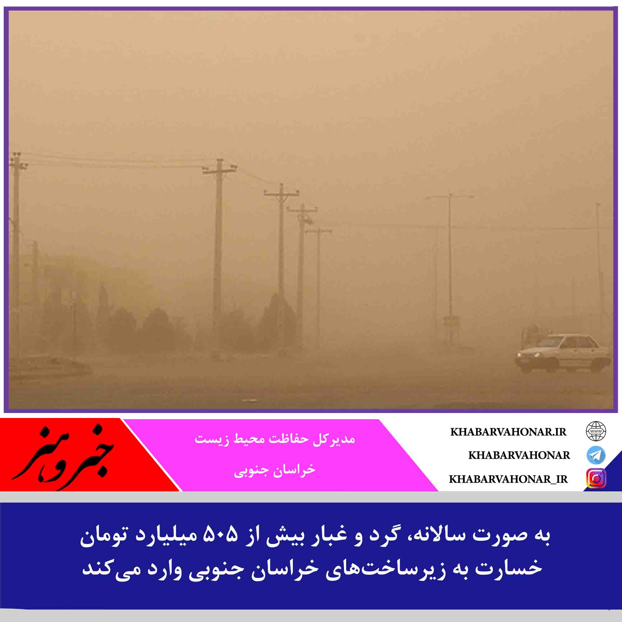 مدیرکل حفاظت محیط زیست خراسان جنوبی گفت: به صورت سالانه، گرد و غبار بیش از ۵۰۵ میلیارد تومان خسارت به زیرساختهای خراسان جنوبی وارد میکند.