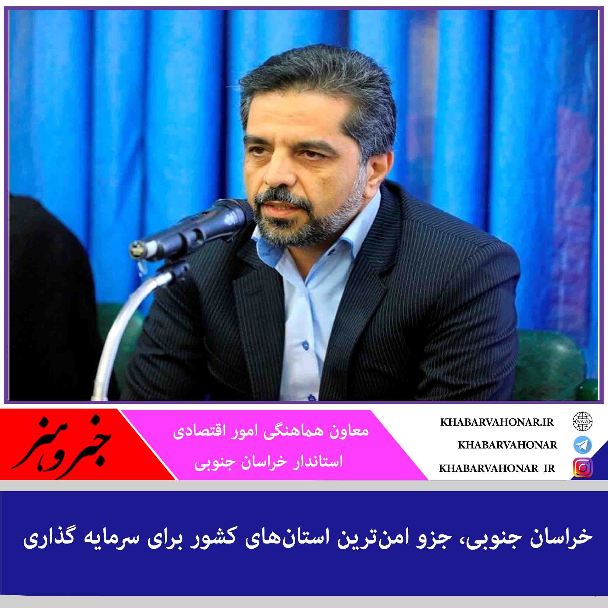?معاون هماهنگی امور اقتصادی استاندار خراسان جنوبی خبر داد: خراسان جنوبی، جزو امنترین استانهای کشور برای سرمایه گذاری است.