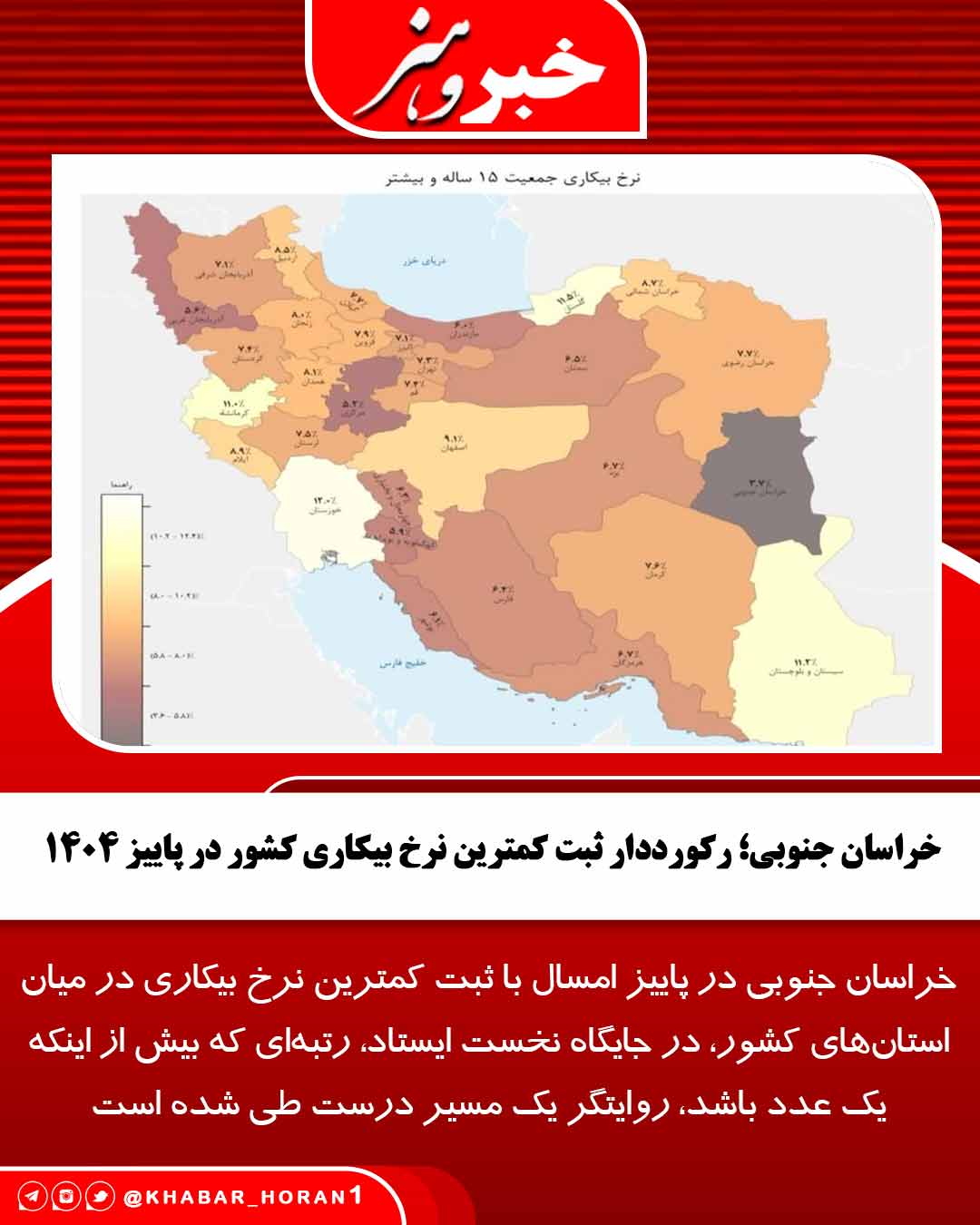 با توجه به آخرین گزارش منتشره مرکز آمار ایران؛ استان خراسان جنوبی در پاییز ۱۴۰۴ با ثبت نرخ بیکاری ۳.۷ درصد، عنوان کمترین نرخ بیکاری کشور را به خود اختصاص داده، رقمی که در مقایسه با تابستان امسال، نشاندهنده یک تحول محسوس در شاخصهای بازار کار است.