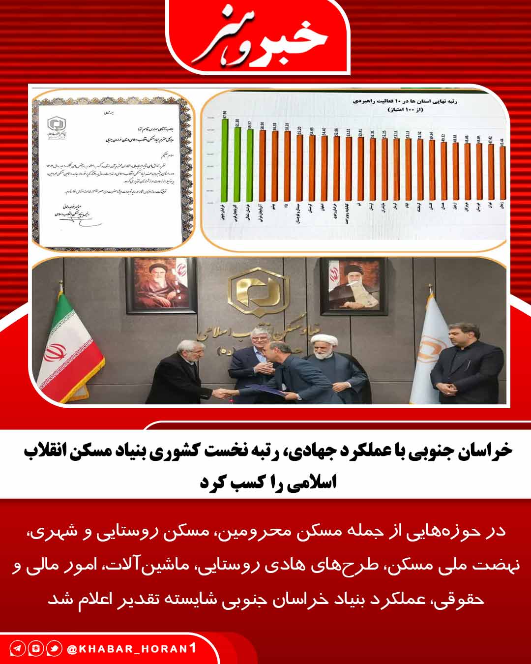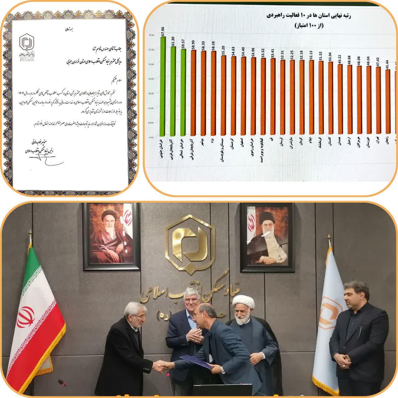 بر اساس ارزیابیهای انجامشده از سوی اداره کل نظارت راهبردی و مدیریت عملکرد بنیاد مسکن انقلاب اسلامی و در میان شاخصهای تعیینشده در حوزههایی از جمله مسکن محرومین، مسکن روستایی و شهری، نهضت ملی مسکن، طرحهای هادی روستایی، ماشینآلات، امور مالی و حقوقی، عملکرد بنیاد مسکن انقلاب اسلامی خراسان جنوبی شایسته تقدیر اعلام شد.