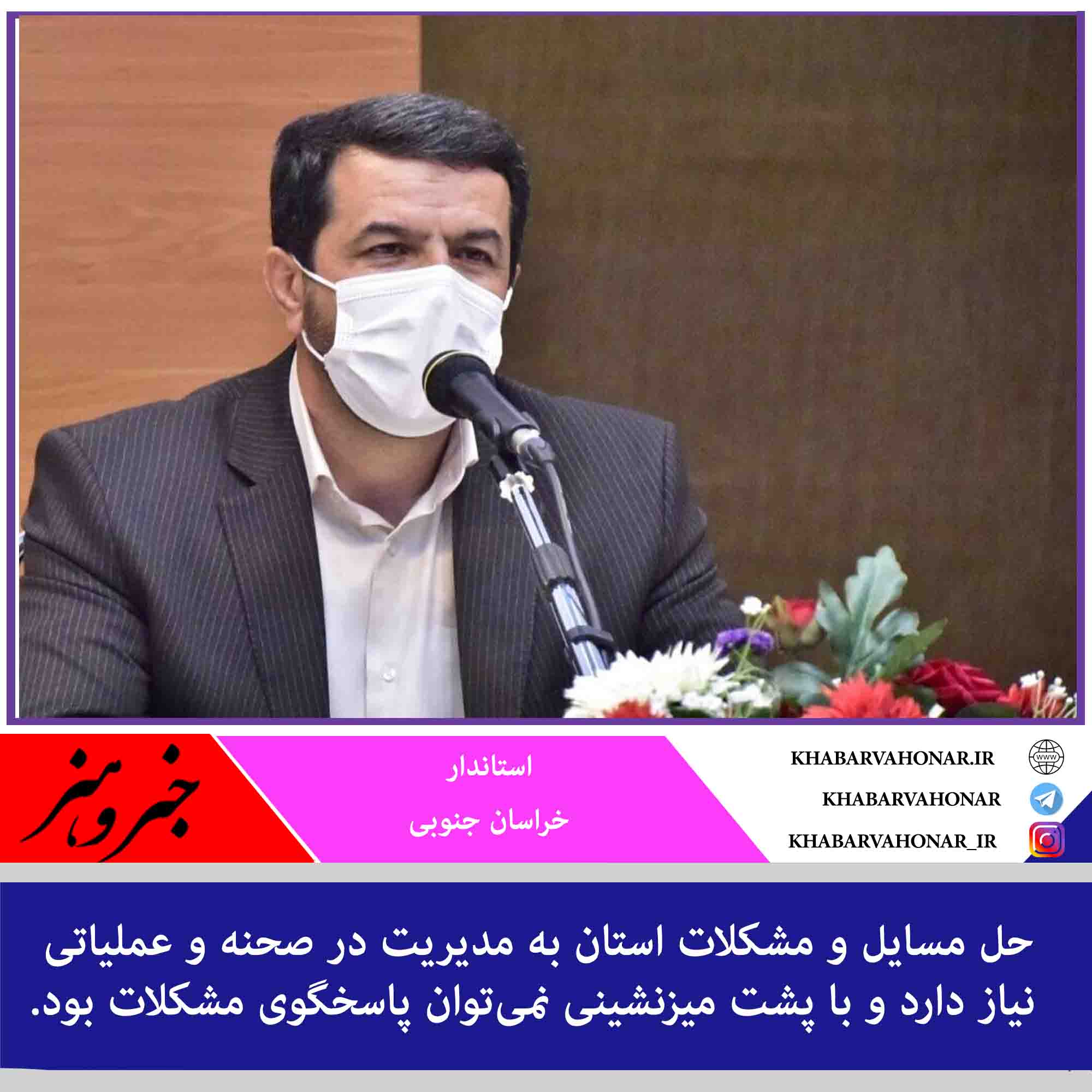 استاندار خراسان جنوبی گفت: حل مسایل و مشکلات استان به مدیریت در صحنه و عملیاتی نیاز دارد و با پشت میزنشینی نمیتوان پاسخگوی مشکلات بود.