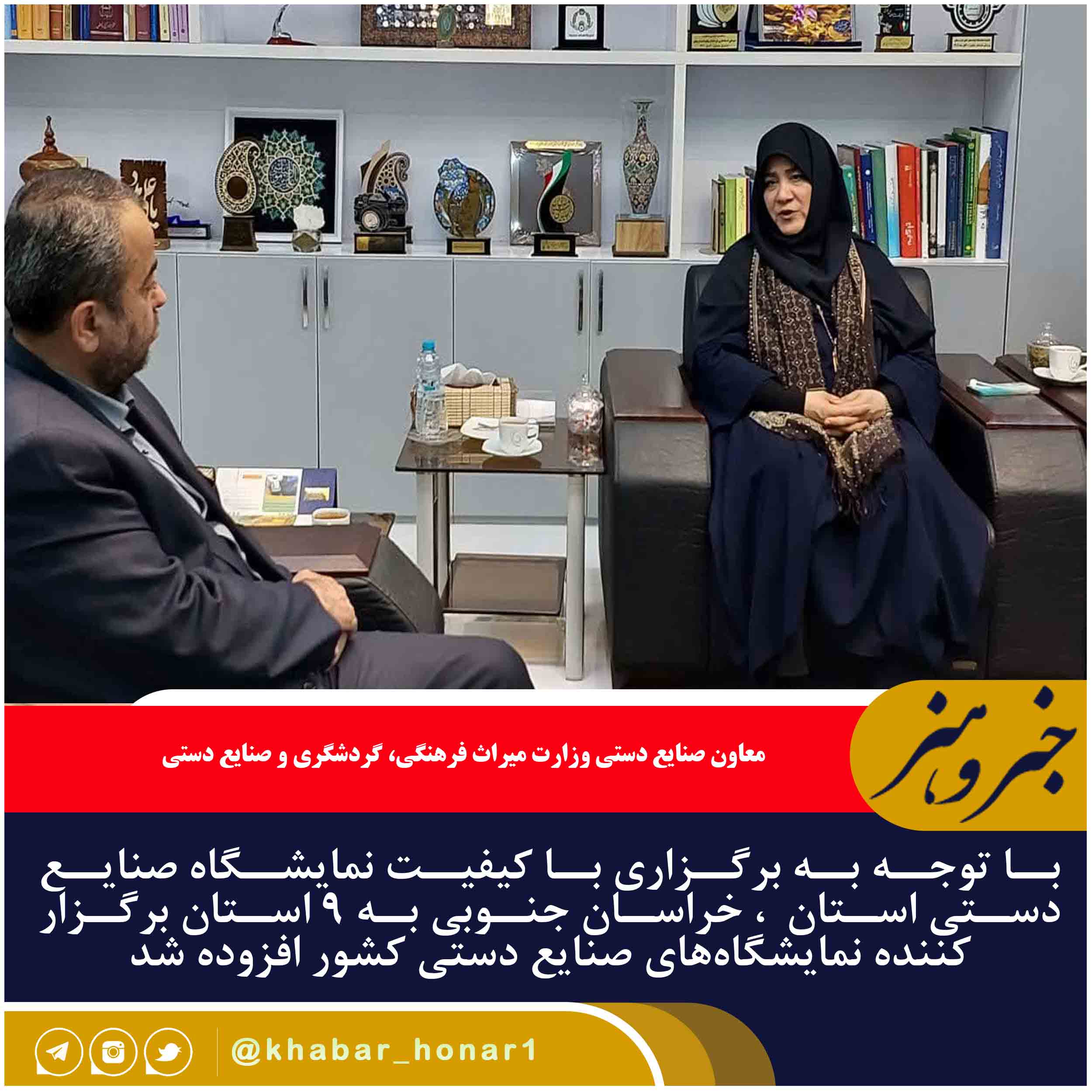 مریم جلالی در دیدار با استاندار خراسان جنوبی افزود: با با توجه به برگزاری با کیفیت نمایشگاه صنایع دستی پارسال و همگرایی در استان خراسان جنوبی، این استان نیز به ۹ استان برگزار کننده نمایشگاههای صنایع دستی کشور افزوده شد.