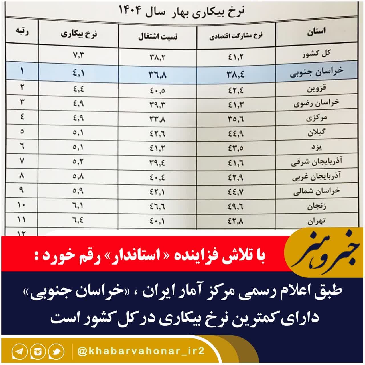 با تلاش های فزاینده سیدمحمدرضا هاشمی ، طبق اعلام رسمی مرکز آمار ایران ، خراسان جنوبی دارای کمترین نرخ بیکاری در کل کشور است. این آمار که طبق پایش سه ماهه بهار سال جاری منتشر شده است ، نشان دهنده ایجاد اشتغال در این استان «علاوه بر میزان تعهدات» است. استاندار خراسان جنوبی با برنامه ریزی دقیق و تلاش های فزاینده موجب شد تا با حمایت از ایجاد اشتغال ، احیا واحدهای راکد ، بهره گیری از تسهیلات بانکی در مسیر صحیح ، ایجاد محیط مناسب برای کسب و کار و ارتقا امنیت سرمایه گذاری و تثبیت اشتغال در استان ، موفق شد خراسان جنوبی را در صدر جدول کمترین نرخ بیکاری کشور در بهار سال جاری جای دهد. این در حالی است که استان هایی چون قزوین ، خراسان رضوی ، مرکزی ، گیلان و یزد در رتبه های بعدی و استان تهران در رتبه یازدهم قرار دارد.