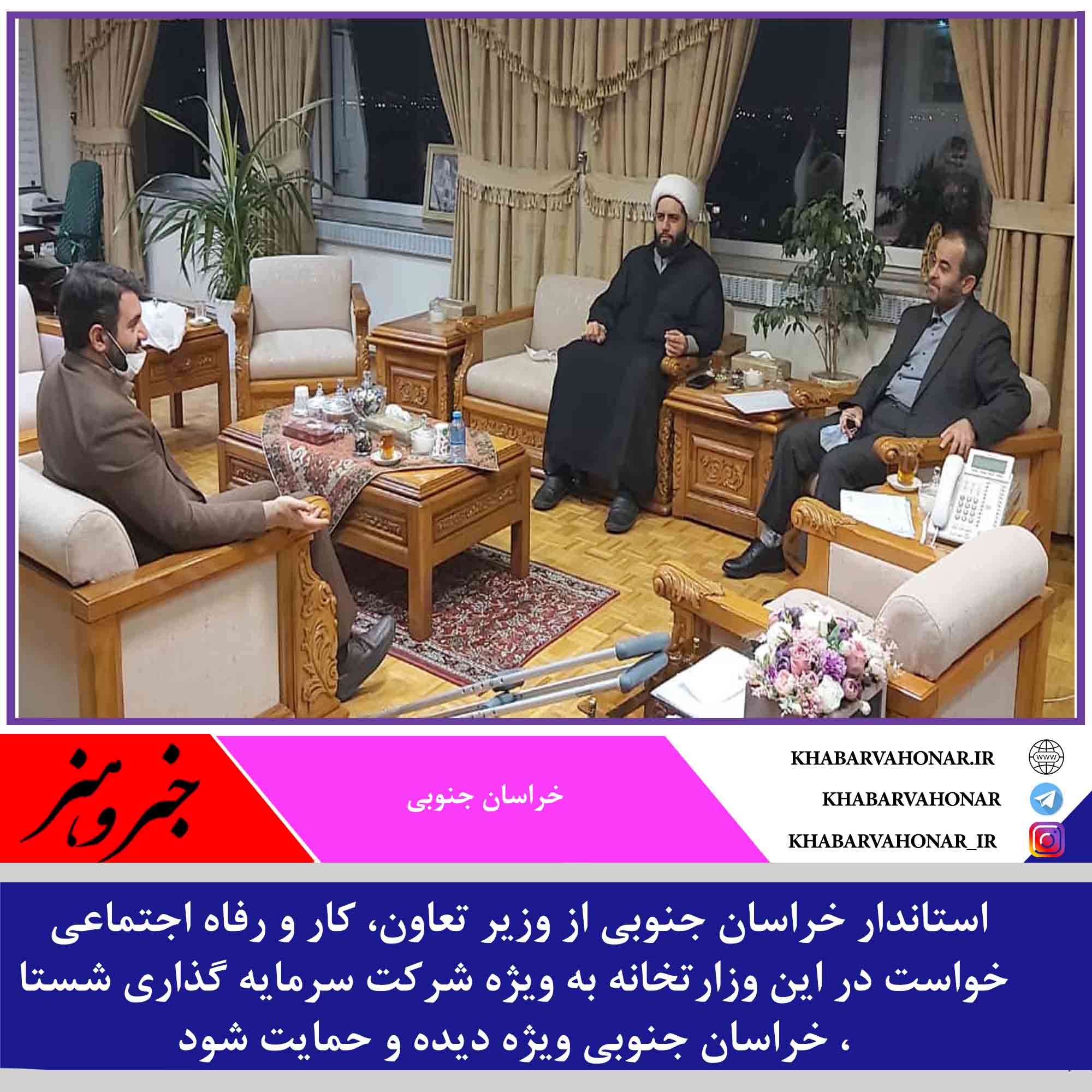 استاندار خراسان جنوبی از وزیر تعاون، کار و رفاه اجتماعی خواست در این وزارتخانه به ویژه شرکت سرمایه گذاری شستا، خراسان جنوبی ویژه دیده و حمایت شود.