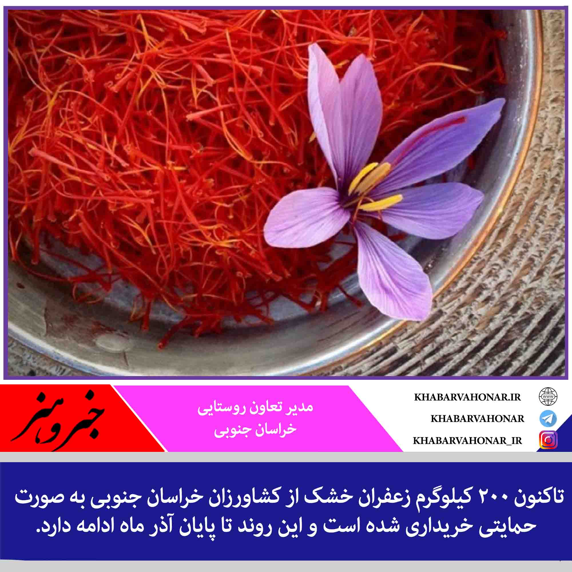 مدیر تعاون روستایی خراسان جنوبی گفت: تاکنون ۲۰۰ کیلوگرم زعفران خشک از کشاورزان استان به صورت حمایتی خریداری شده است و این روند تا پایان آذر ماه ادامه دارد.