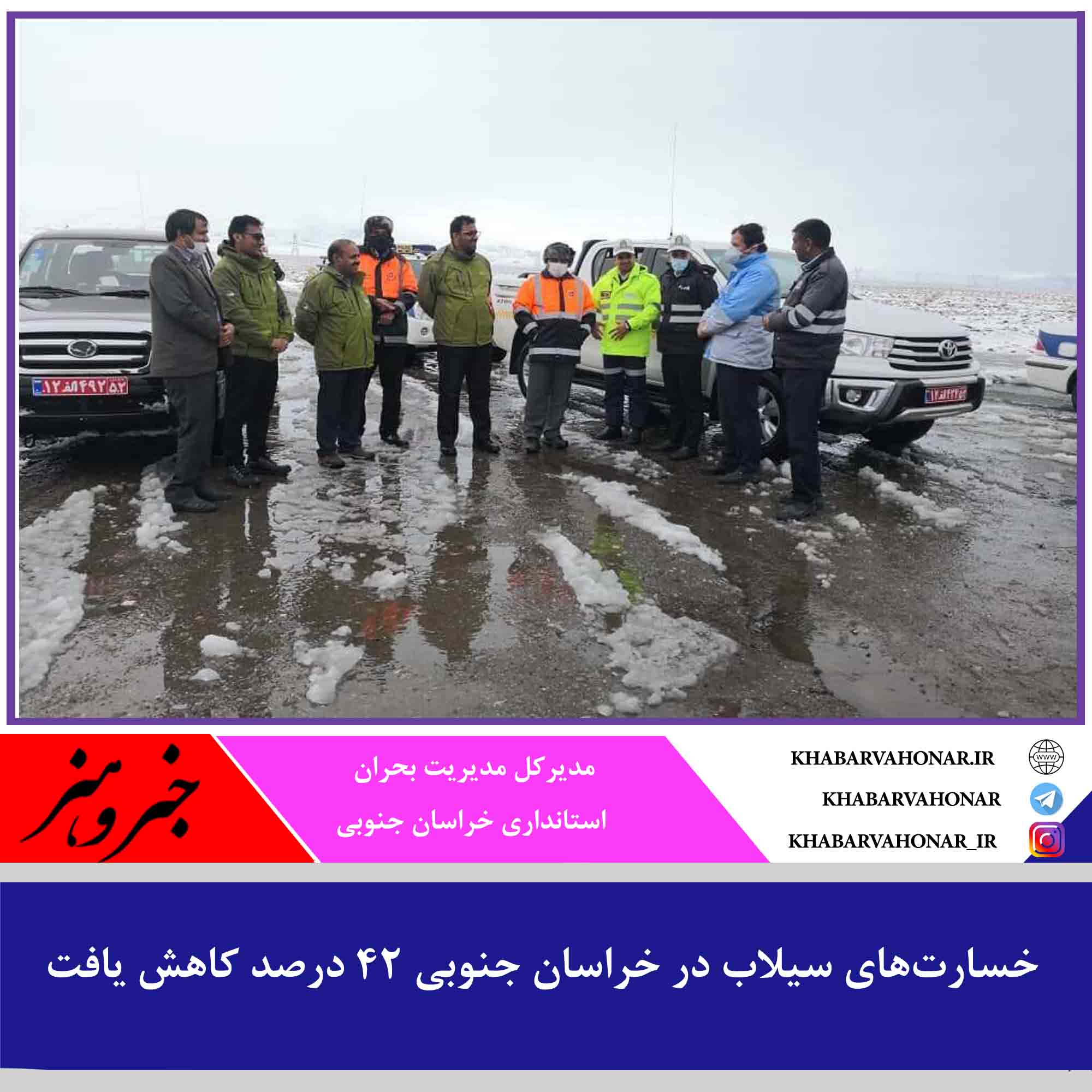 مدیرکل مدیریت بحران استانداری خراسان جنوبی گفت: خسارتهای سیلاب در بارشهای اخیر استان ۴۲ درصد نسبت به بازندگیهای مشابه کاهش داشته است.