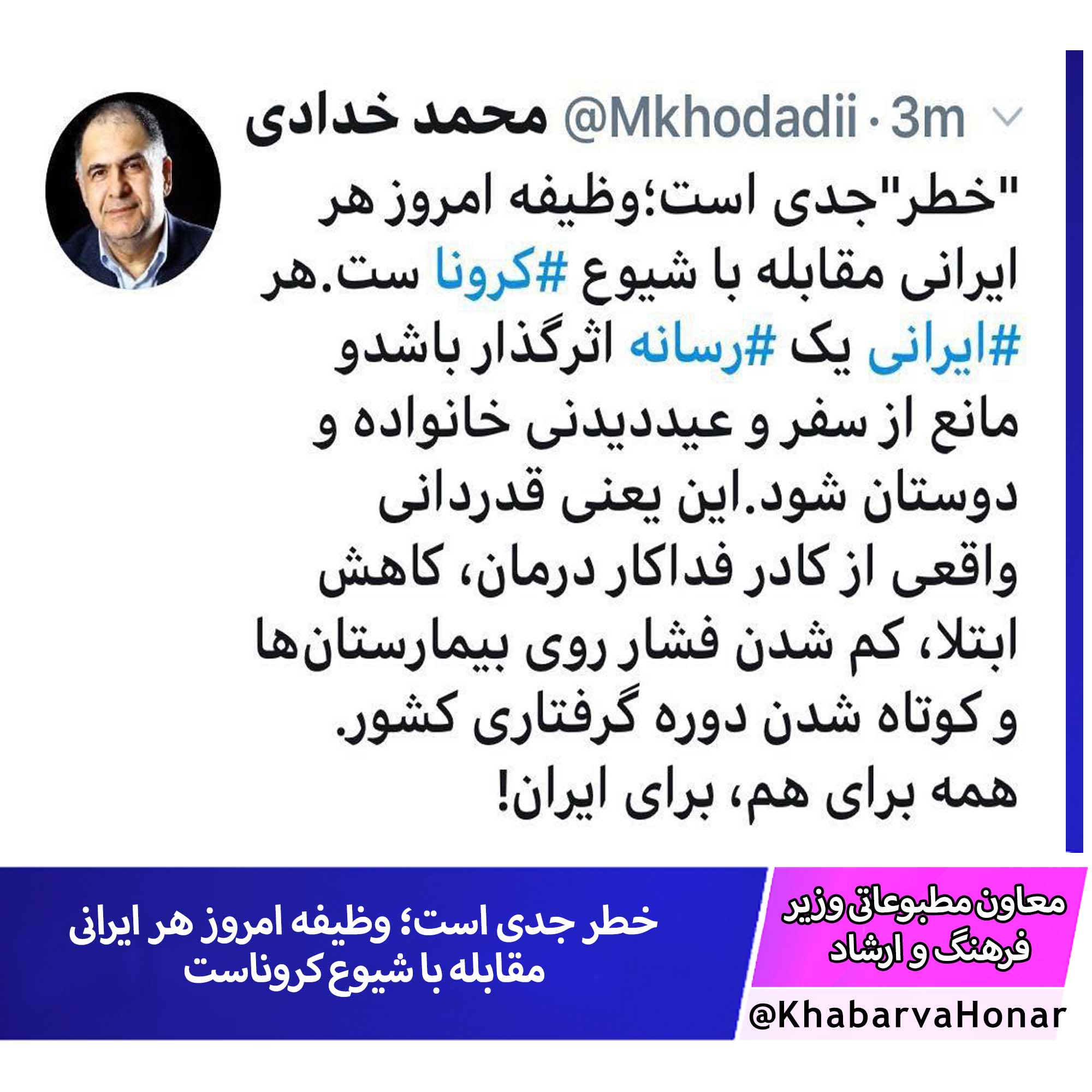 معاون مطبوعاتی وزیر فرهنگ و ارشاد: خطر جدی است؛ وظیفه امروز هر ایرانی مقابله با شیوع کروناست. هر ایرانی یک رسانه اثرگذار باشد و مانع از سفر و عید دیدنی خانواده و دوستان شود.
