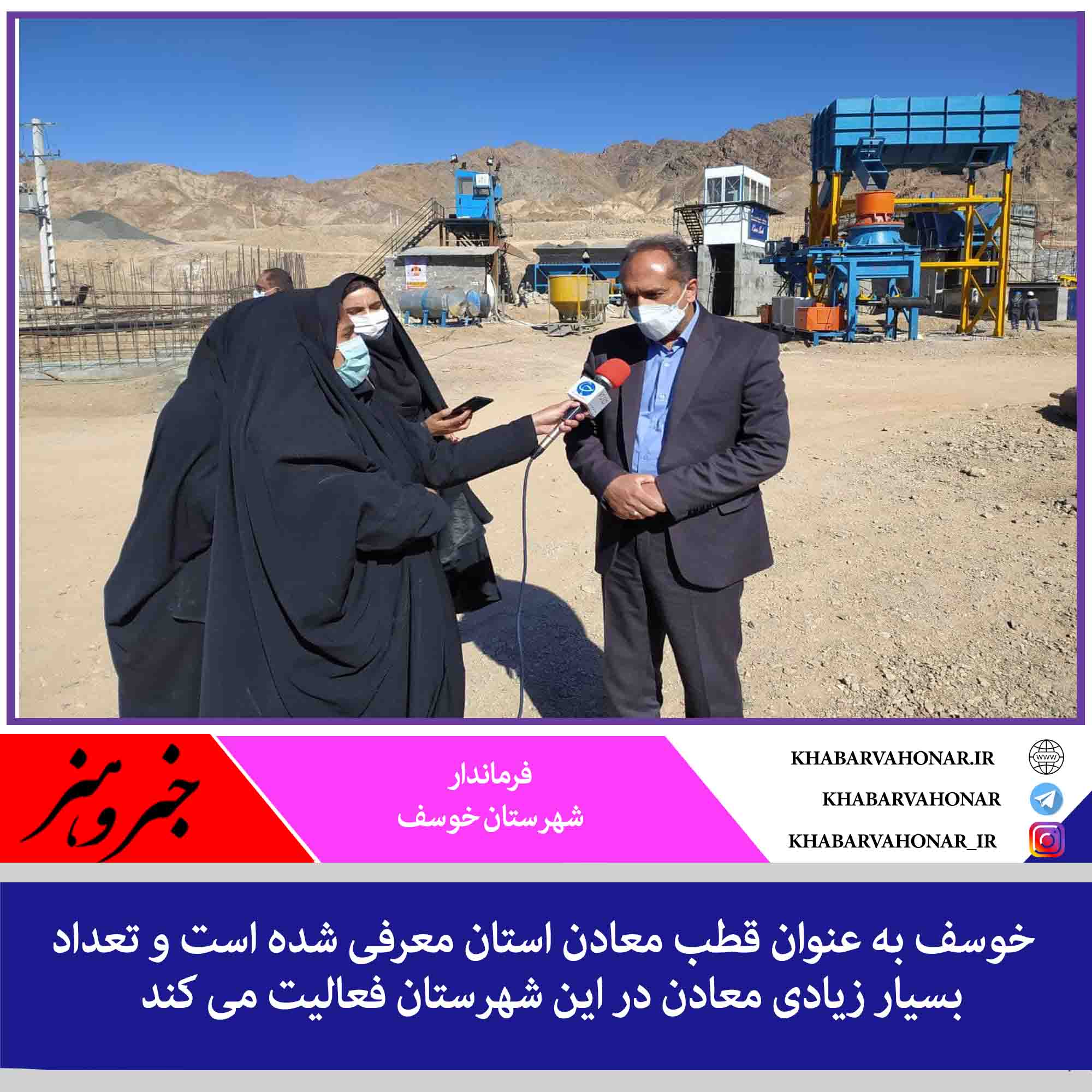 فرماندار خوسف اظهار داشت: ۵ معدن طلای شامل خونیک، شادان، کودکان، قلعه زری و ماهرآباد خوسف را به عنوان قطب معادن طلایی شرق کشور مطرح کرده است و امیدواریم به زودی این معدن به مرحله فرآوری محصولات خود برسند.
