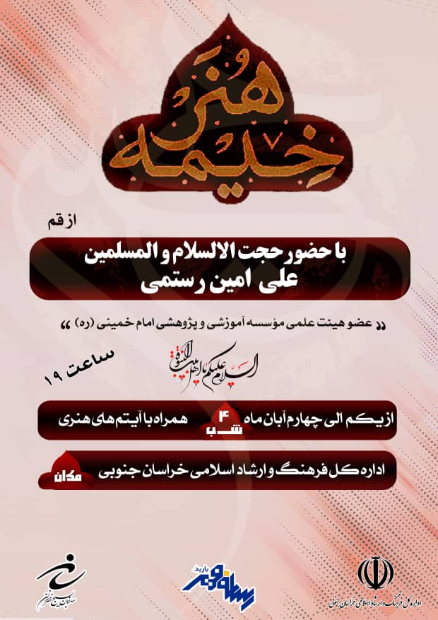 برگزاری خیمه هنر از یکم تا چهارم آبان ماه ساعت ۷ شب در اداره کل فرهنگ و ارشاد اسلامی خراسان جنوبی