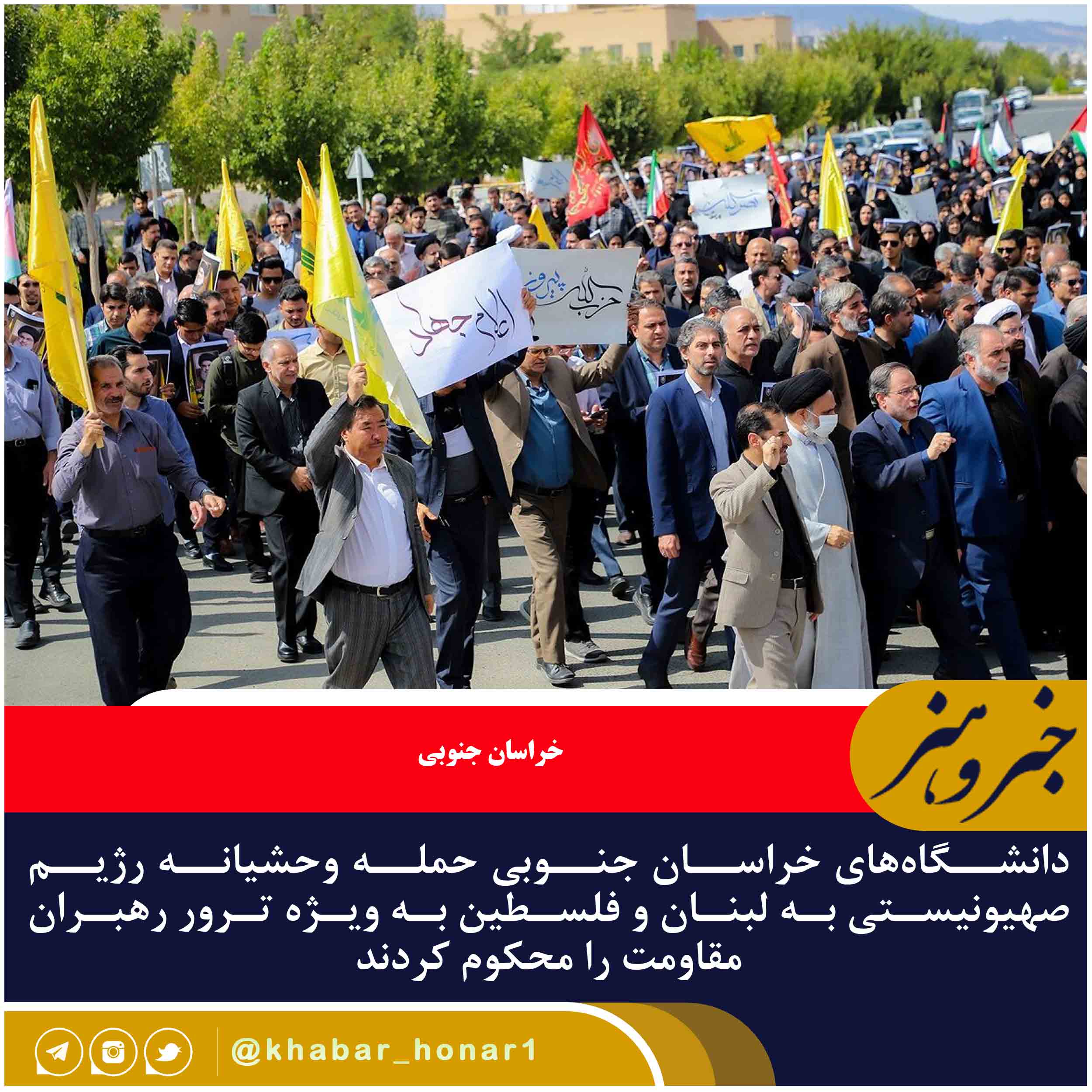 دانشجویان، روسا و اساتید دانشگاههای خراسان جنوبی روز یکشنبه با تجمع در دانشگاه بیرجند حمله وحشیانه رژیم صهیونیستی به لبنان و فلسطین به ویژه ترور رهبران مقاومت را محکوم کردند.