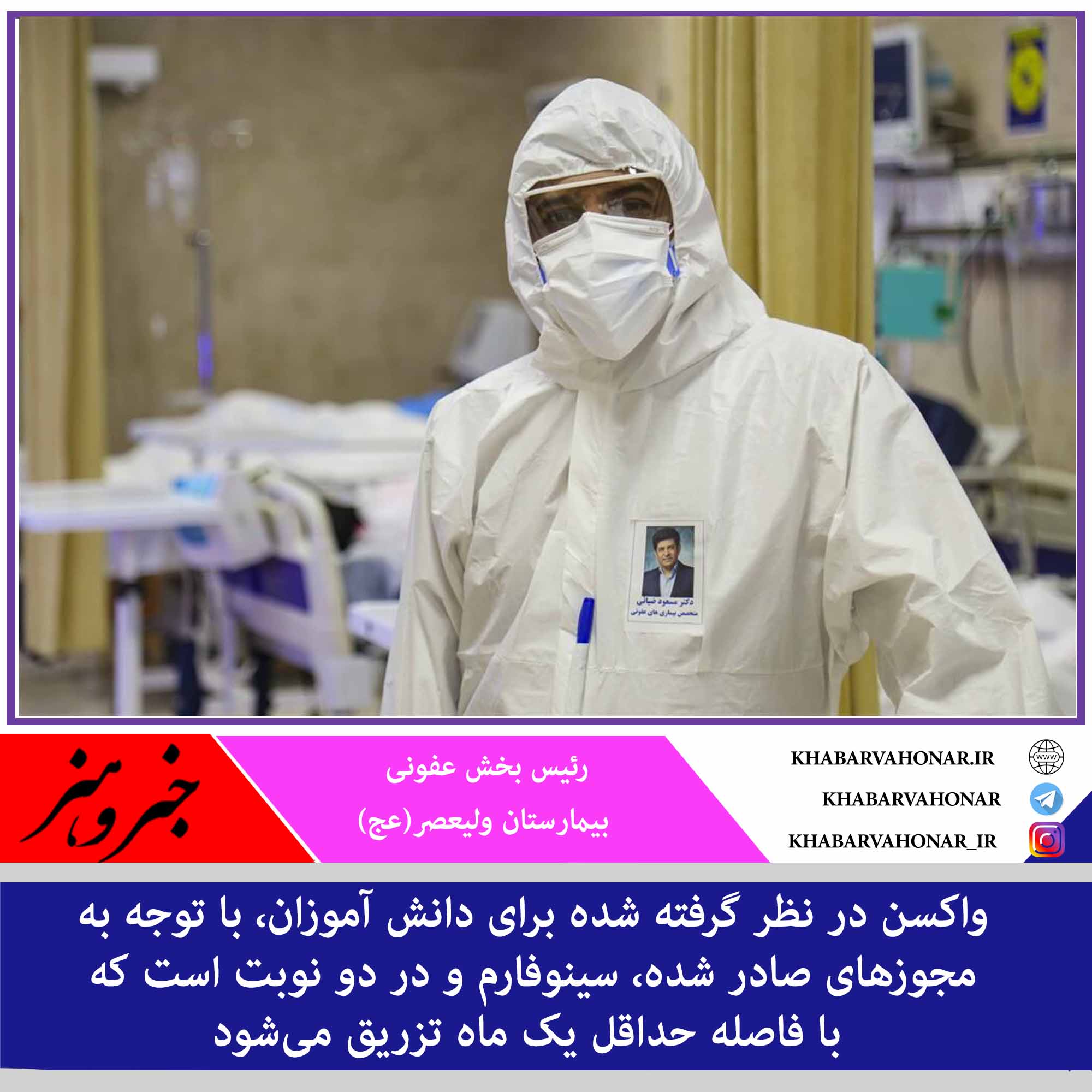 رئیس بخش عفونی بیمارستان ولیعصر(عج) بیرجند گفت: واکسن در نظر گرفته شده برای دانش آموزان، با توجه به مجوزهای صادر شده، سینوفارم و در دو نوبت است که با فاصله حداقل یک ماه تزریق میشود.