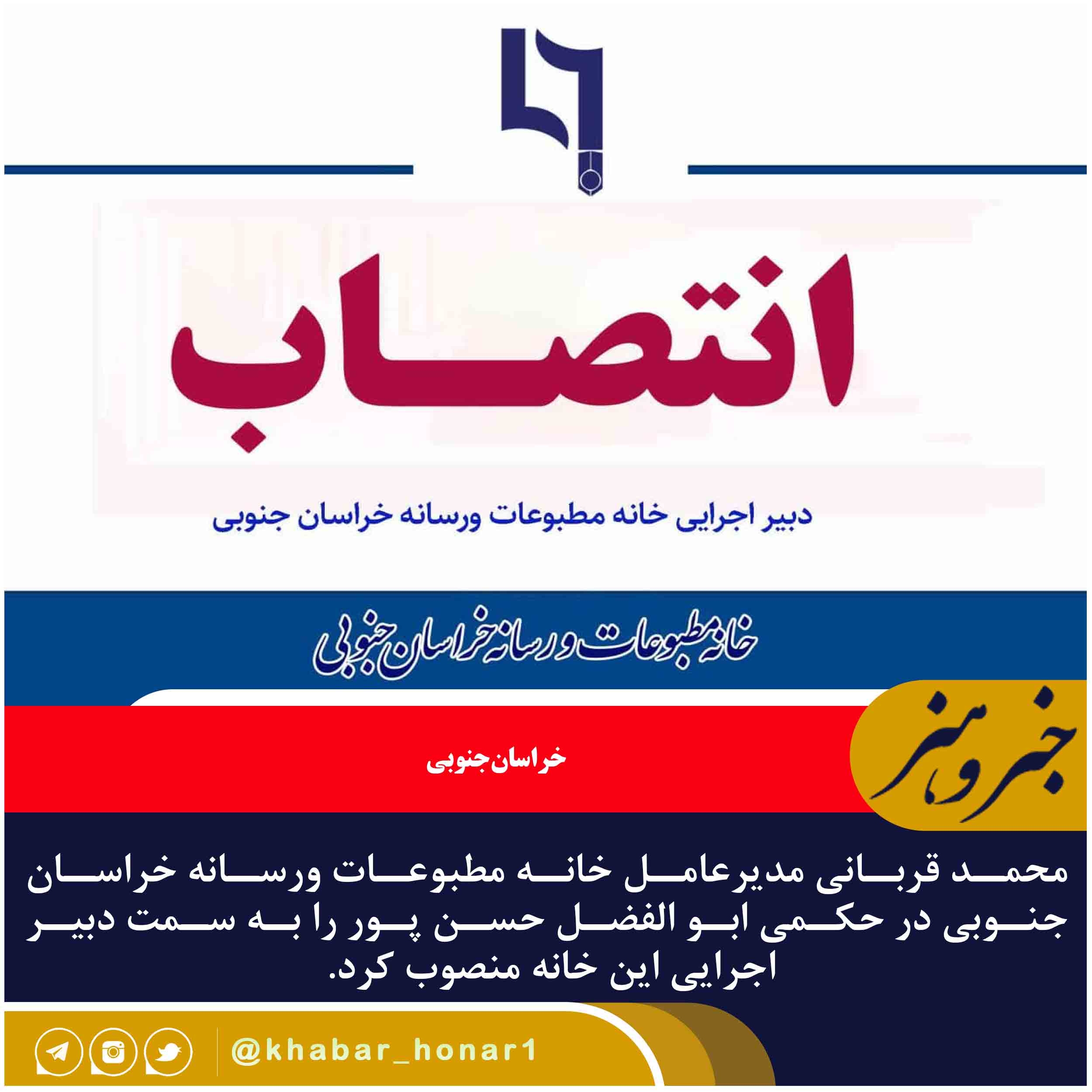 ?محمد قربانی مدیرعامل خانه مطبوعات ورسانه خراسان جنوبی در حکمی ابو الفضل حسن پور را به سمت دبیر اجرایی این خانه منصوب کرد.