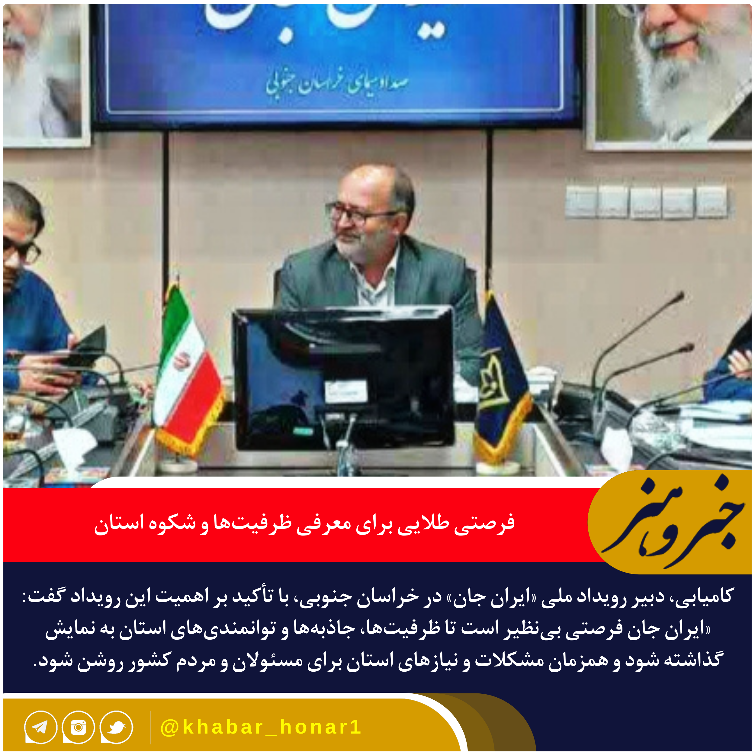 به گزارش خبر و هنر، کامیابی، دبیر رویداد ملی «ایران جان» در خراسان جنوبی، با تأکید بر اهمیت این رویداد گفت: «ایران جان فرصتی بینظیر است تا ظرفیتها، جاذبهها و توانمندیهای استان به نمایش گذاشته شود و همزمان مشکلات و نیازهای استان برای مسئولان و مردم کشور روشن شود.»