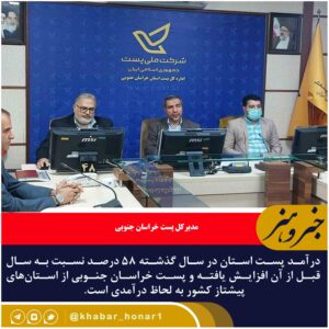 مدیرکل پست خراسان جنوبی گفت: درآمد پست استان در سال گذشته ۵۸ درصد نسبت به سال قبل از آن افزایش یافته و پست خراسان جنوبی از استان‌های پیشتاز کشور به لحاظ درآمدی است.