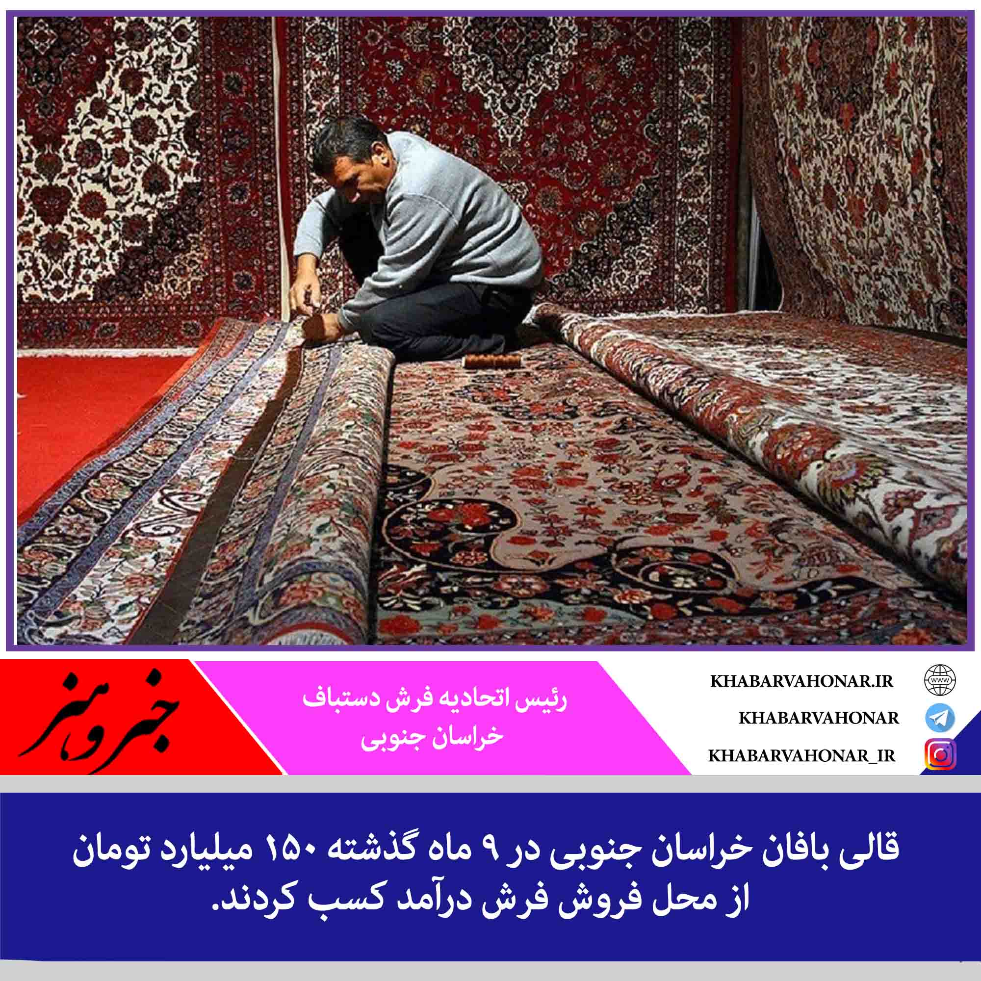 قالی بافان خراسان جنوبی در ۹ ماه گذشته ۱۵۰ میلیارد تومان از محل فروش فرش درآمد کسب کردند.