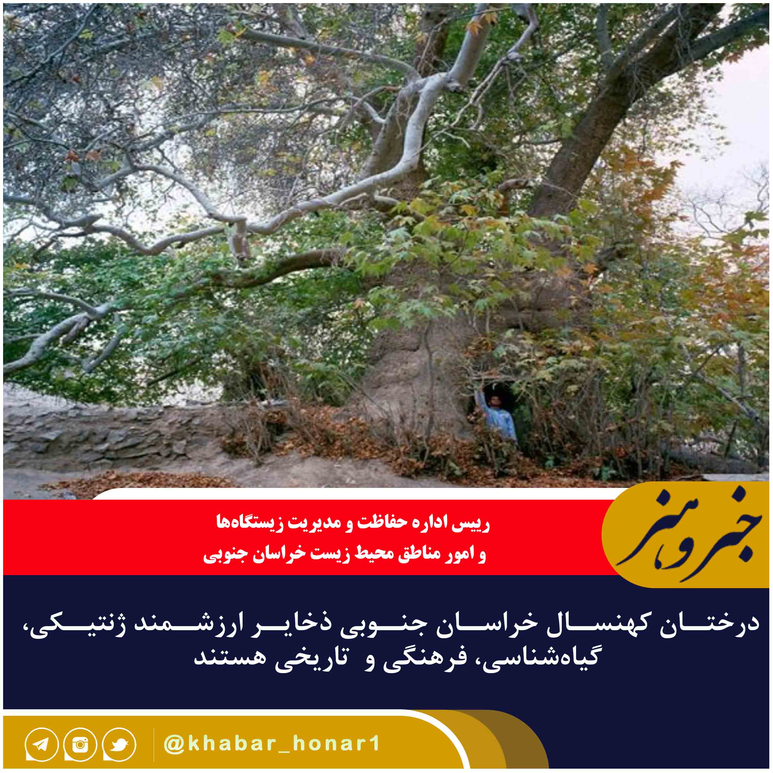 وی با بیان اینکه در ایران حدود ۳۰۰ درخت کهن سال با عمر پنج هزار سال شناسایی شده است و برآورد میشود تعداد واقعی آنها در حدود هزار پایه باشد که اغلب در حاشیه کویر قرار دارند، تصریح کرد: در استان خراسان جنوبی چندین درخت کهنسال چنار، سرو و گز با قدمت ۱۷۰ تا ۱۵۰۰ سال در شهرهای قاین، بیرجند، طبس و درمیان وجود دارد؛ این آثار شامل دو درخت چنارکهنسال ۳۰۰ تا ۵۵۰ ساله و درختان سرو هزار تا ۱۵۰۰ ساله در شهرستان قائن، ۲ سرو با قدمت ۶۵۰ تا ۱۵۰۰ ساله، یک درخت زیتون با ۷۰۰ سال سن و یک گز ۱۷۰ ساله در شهرستان طبس و یک چنار با قدمت ۴۰۰ تا ۴۵۰ سال در شهرستان درمیان است.
