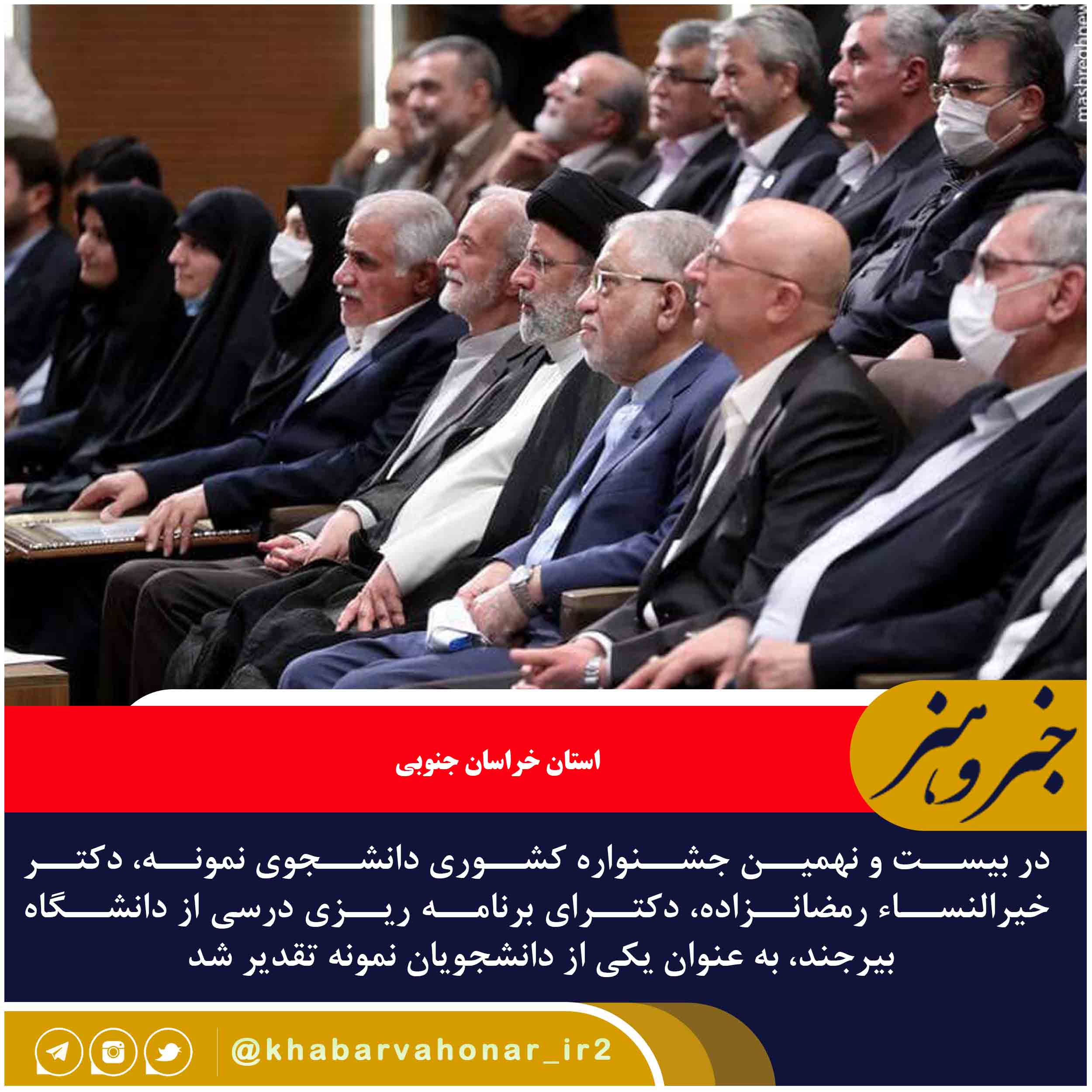 در بیست و نهمین جشنواره کشوری دانشجوی نمونه که دوشنبه سیزدهم تیر ماه ۱۴۰۱ برگزار گردید دکتر خیرالنساء رمضانزاده، دکترای برنامه ریزی درسی از دانشگاه بیرجند، به عنوان یکی از دانشجویان نمونه تقدیر شد.