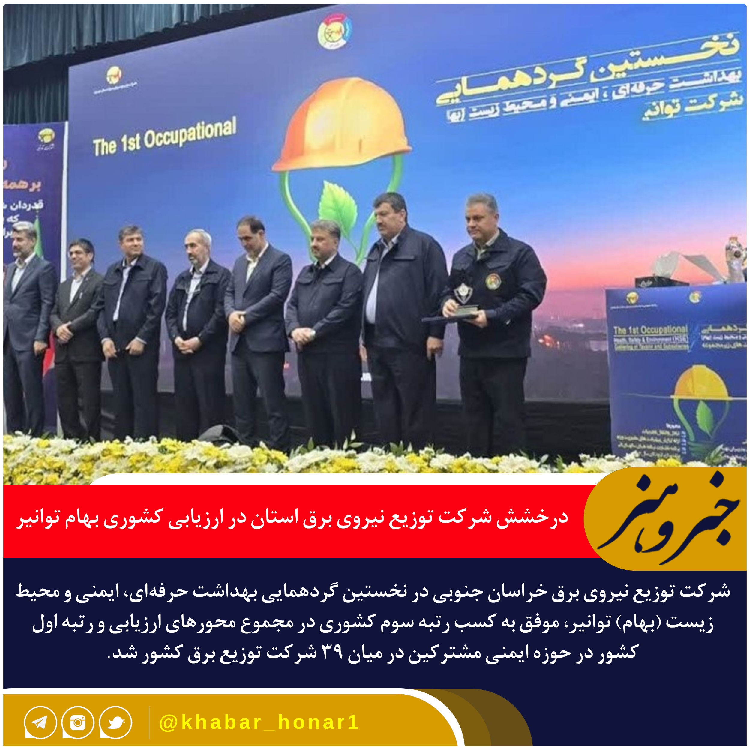 به گزارش خبر و هنر، شرکت توزیع نیروی برق خراسان جنوبی در نخستین گردهمایی بهداشت حرفهای، ایمنی و محیط زیست (بهام) توانیر، موفق به کسب رتبه سوم کشوری در مجموع محورهای ارزیابی و رتبه اول کشور در حوزه ایمنی مشترکین در میان ۳۹ شرکت توزیع برق کشور شد.
