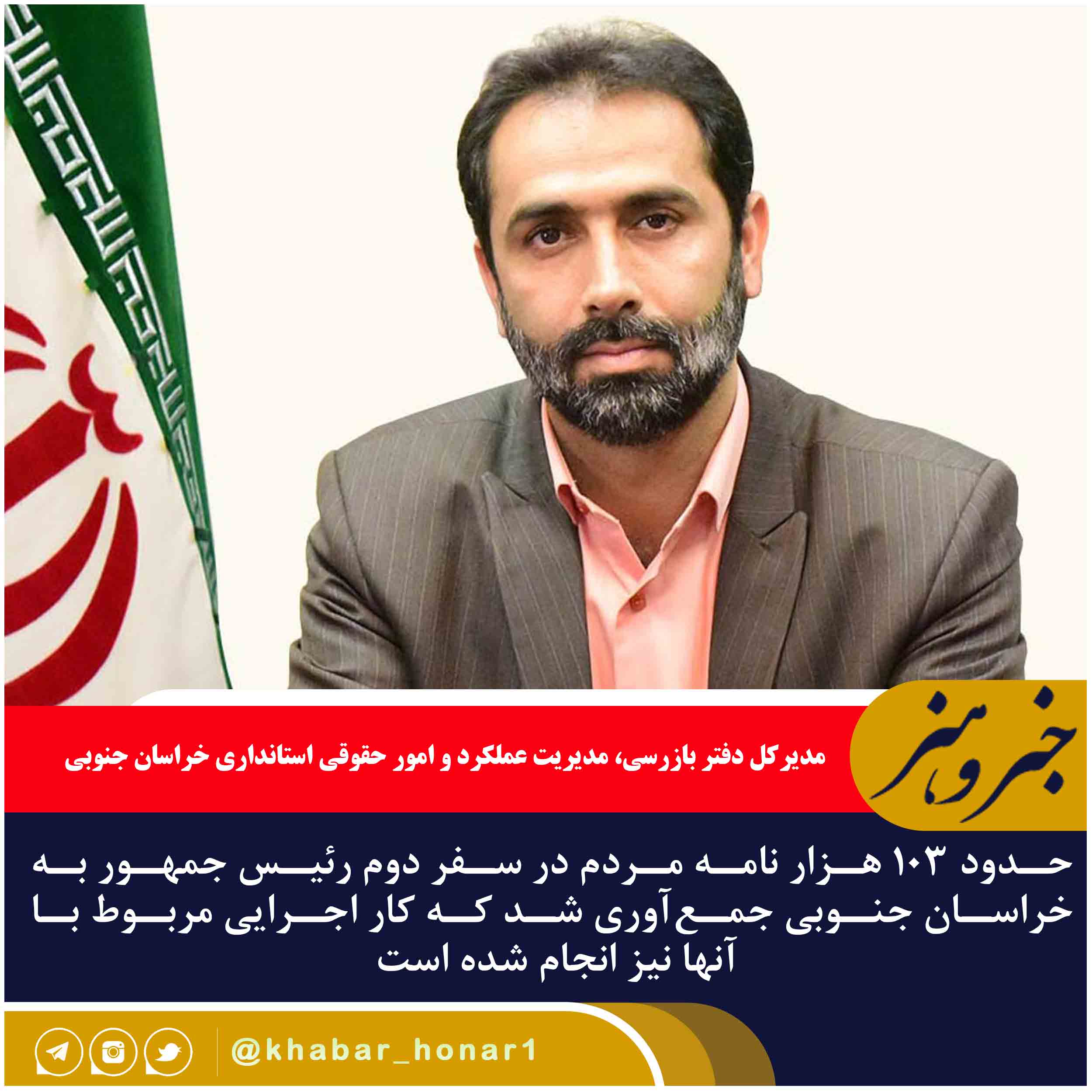مدیرکل دفتر بازرسی، مدیریت عملکرد و امور حقوقی استانداری خراسان جنوبی گفت: حدود ۱۰۳ هزار نامه مردم در سفر دوم رئیس جمهور به خراسان جنوبی جمعآوری شد که کار اجرایی مربوط با آنها نیز انجام شده است.
