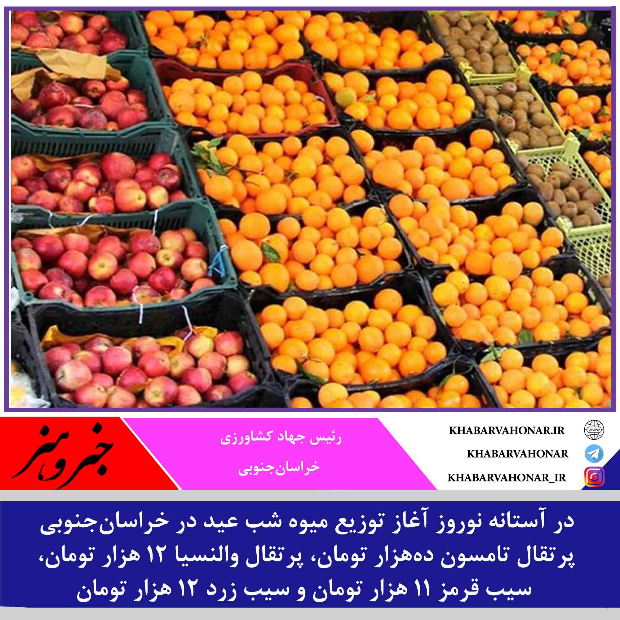 رئیس جهاد کشاورزی خراسان‌جنوبی گفت: توزیع ۸۰۰ تن میوه تنظیم بازار شب آغاز توزیع میوه شب عید در خراسان‌جنوبیعید شامل ۴۰۰ تن پرتقال و ۴۰۰ تن سیب آغاز شده که شامل پرتقال تامسون و والنسیا و سیب زرد و قرمز است.