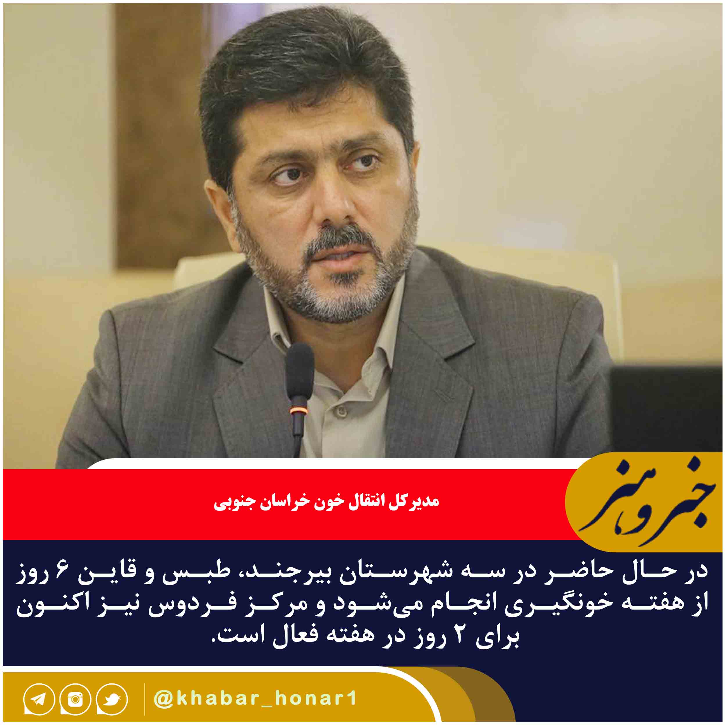 وی یادآور شد: در حال حاضر در سه شهرستان بیرجند، طبس و قاین ۶ روز از هفته خونگیری انجام میشود و مرکز فردوس نیز اکنون برای ۲ روز در هفته فعال است.