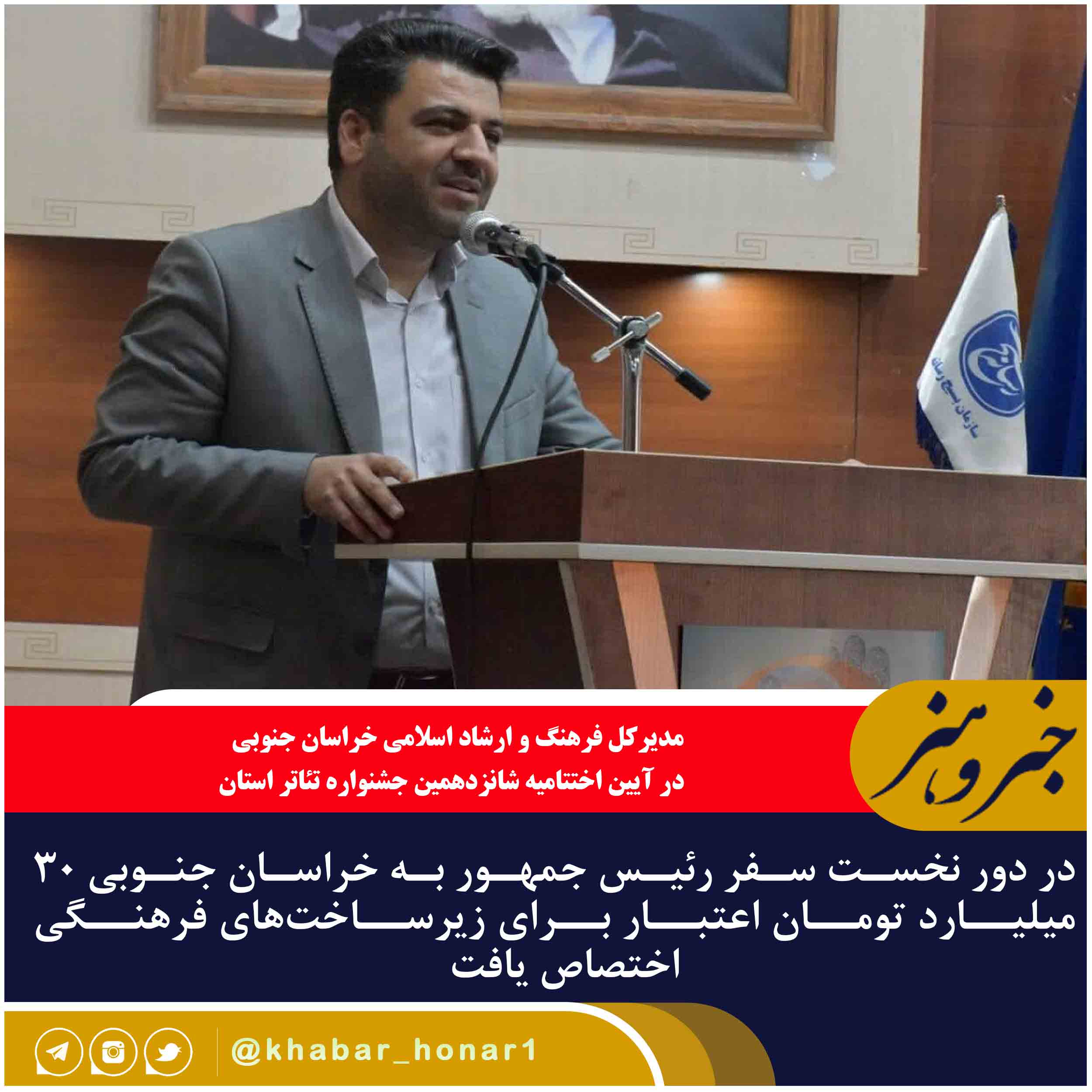 مدیرکل فرهنگ و ارشاد اسلامی خراسان جنوبی گفت: در دور نخست سفر رئیس جمهور به استان ۳۰ میلیارد تومان اعتبار برای زیرساختهای فرهنگی اختصاص یافت که به زودی ۱۸ میلیارد تومان آن به صورت نقدی تخصیص مییابد.