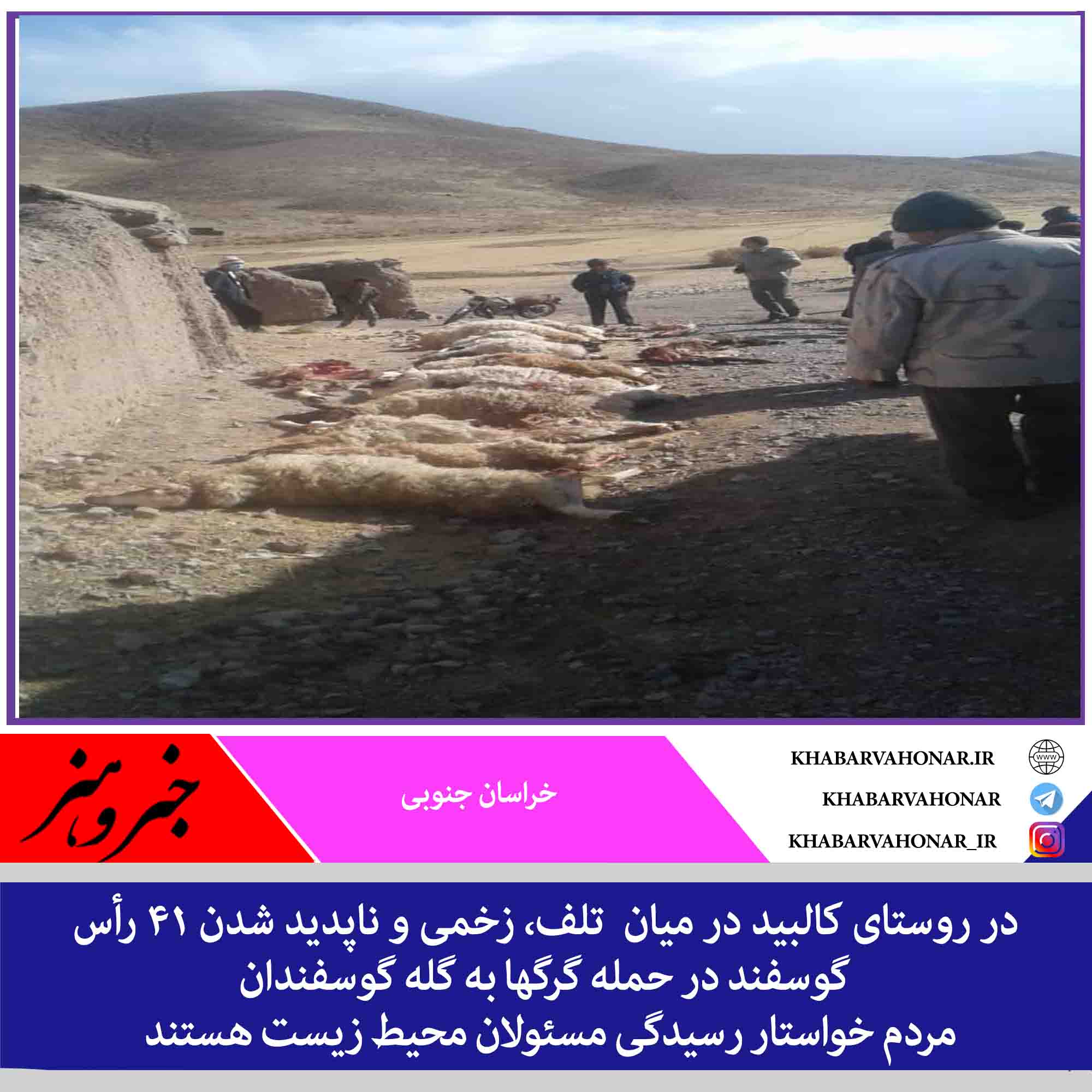 ?در حمله گرگها به یک گله گوسفند روستای کالبید درمیان که عصر دیروز رخ داد، حدود ۲۰ رأس گوسفند تلف شدند، ۱۰ رأس زخمی و و ۱۱ رأس ناپدید شدند .